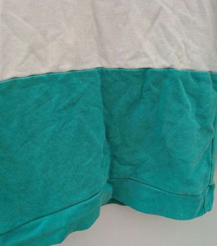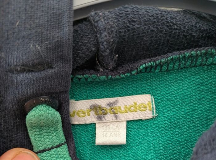 Marque : Vertbaudet Taille : 10 ans / 138 cm Couleur : Tricolore (Marine, Blanc cassé, Vert d'eau / Turquoise) Détails du vêtement : Design : Joli motif "drapeau" sur la poitrine composé de petites ancres marines, parfait pour un look bord de mer. Coupe : Sweat avec capuche et cordon de serrage contrasté. Dos : Le dos est principalement vert avec un empiècement marine au niveau de la capuche. État : Bon état général. Note : Le sweat est un peu froissé suite au stockage et l'étiquette de marque est marquée au feutre, mais le vêtement reste très propre et prêt à être porté.