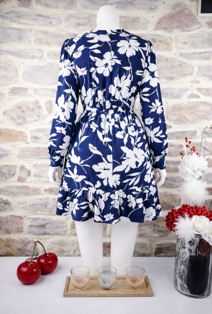 Robe éclat florale marine aux fleurs blanches Femme Taille 52 marque Boohoo ✴️ Manches longues amples ✴️ Taille froncée élastiquée ✴️ Col en V avec deux petits liens ✴️ Coupe fluide et confortable dotée d un motif floral audacieux et stylisé, en blanc pur sur ur fond bleu marine intense. ✴️ Composition => 95 % polyester 5 % elastanne ✴️ Longueur => 105 centimètres ✴️ Mesure épaules à épaules => 46,5 centimètres ✴️ Tour de poitrine => 130 centimètres