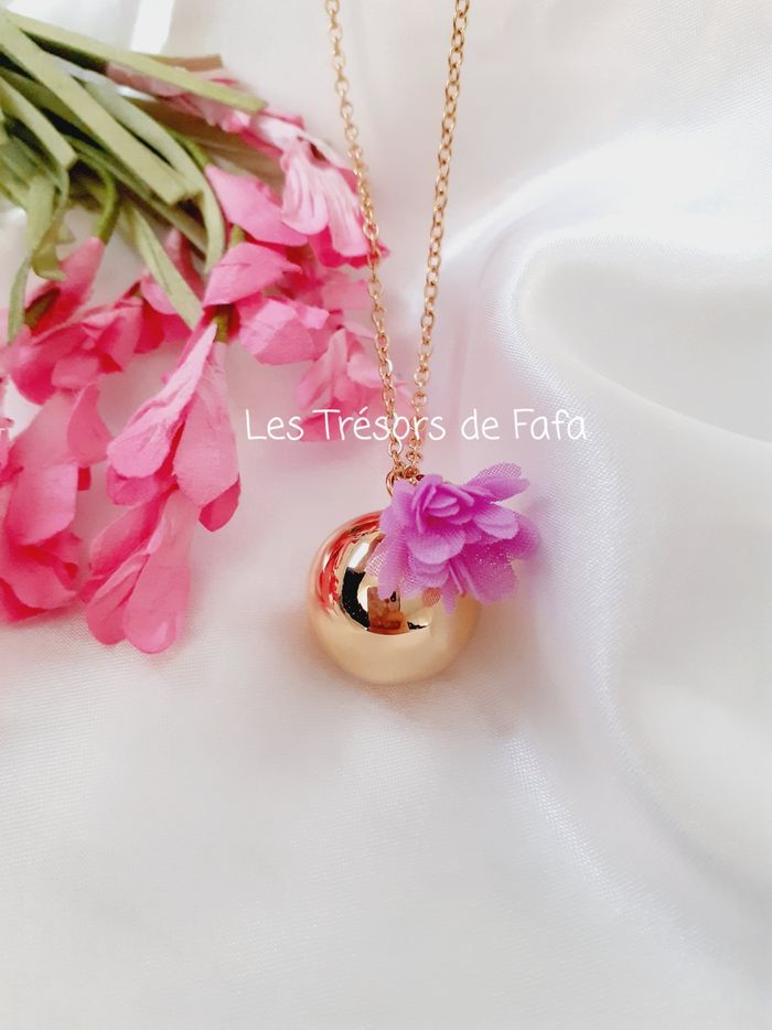 🤰 Bola de grossesse fait-main composé : - d'une chaîne en acier inoxydable doré d'une longueur d'environ 107 cm. - d'une boule sonore plaquée or de diamètre 20 mm. - d'un pendentif fleur violette.