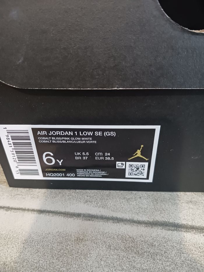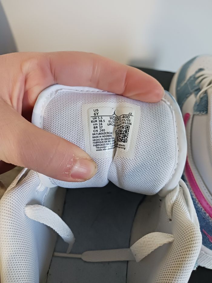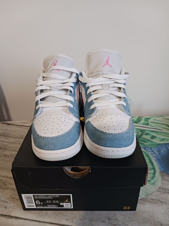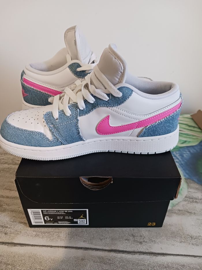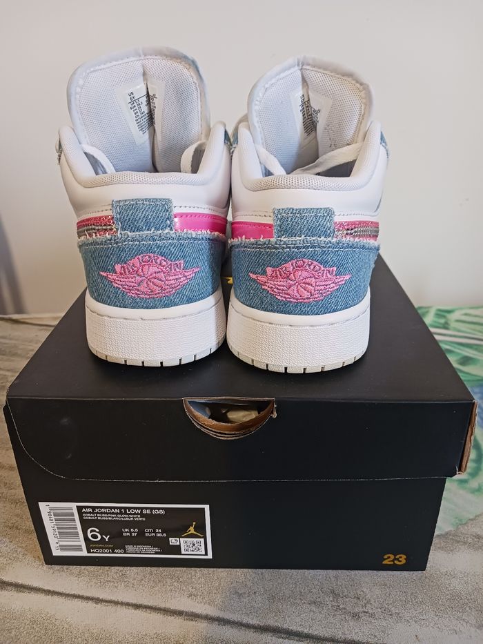 Nike air jordan en cuir blanche avec du jeans bleu clair et signe Nike rose en sequin Très peu porté