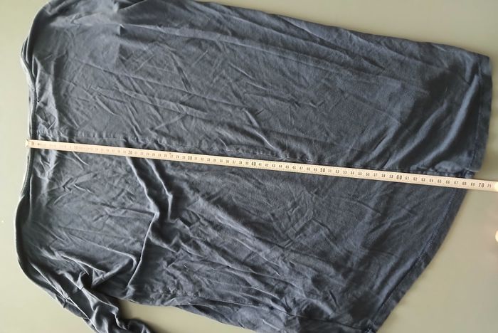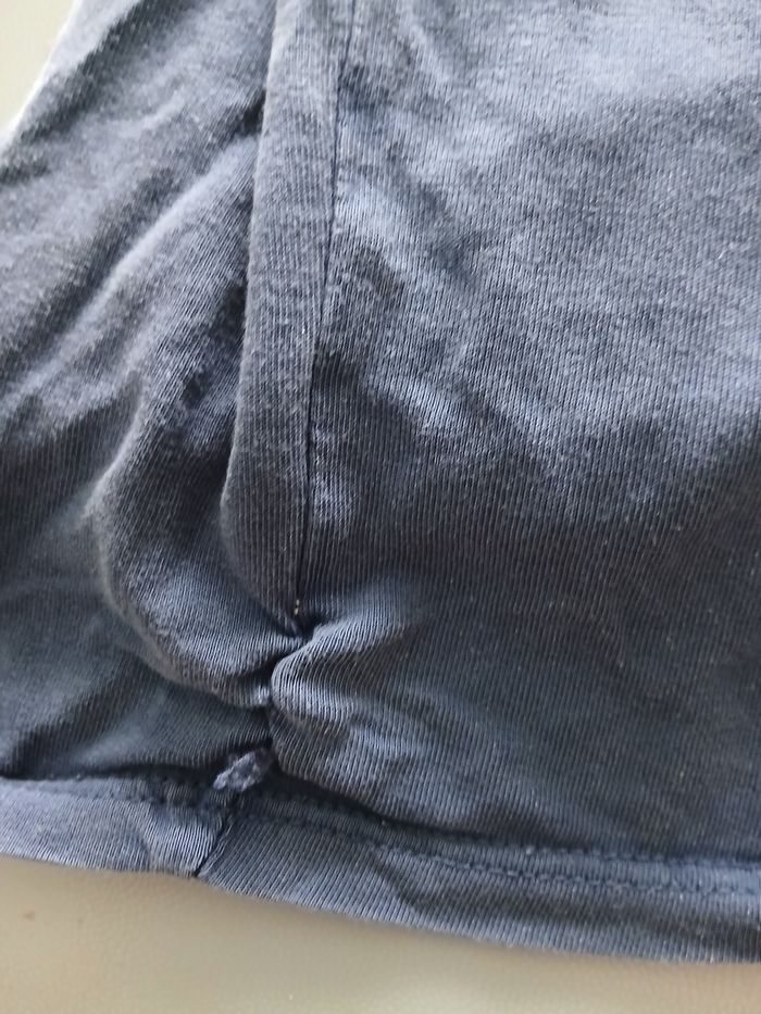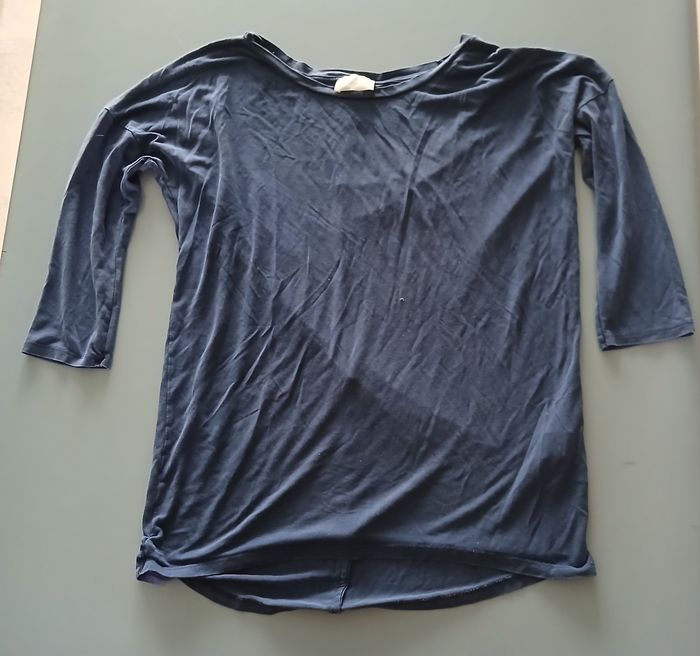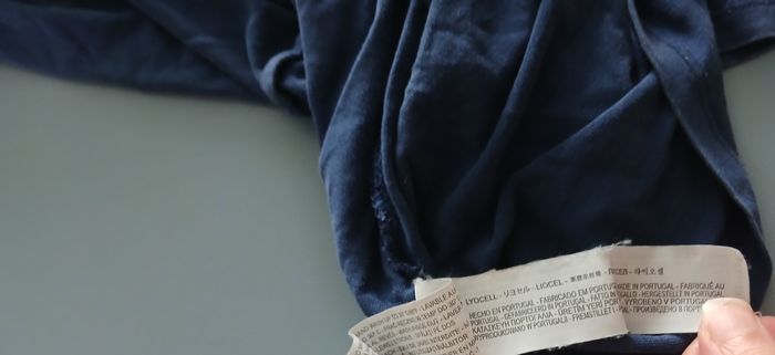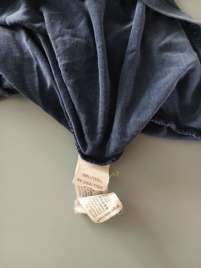 taches 1 couture recousue en bas bleu foncé coupe plus long dos que devant il y a une couture dans le dos sur toute la hauteur longueur dos 69 cm made in Portugal 100 % lyocel
