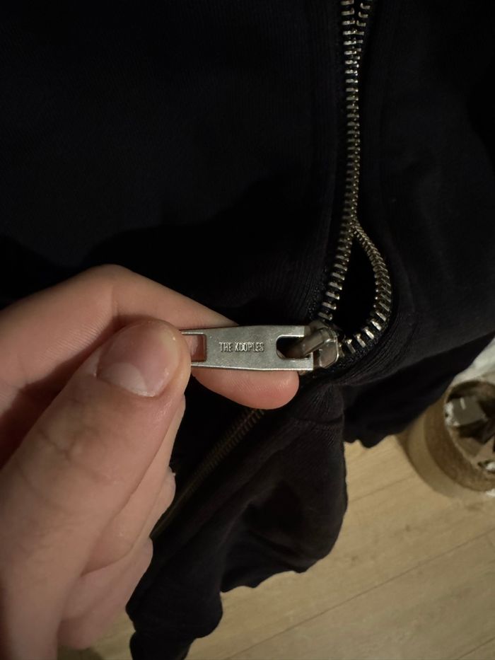 Veste the kooples noir ( le marrons au niveau du milieu c’est juste un effet de lumière) elle a un tout petit trou au niveau de l’épaule mais peu être très facile recousu taille M