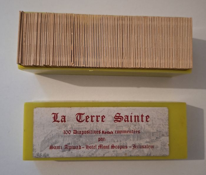 Boîte en plastique comprenant 100 diapositives Kodak de la Terre Sainte. Article très vintage. En très bon état étant donné I'ancienneté.