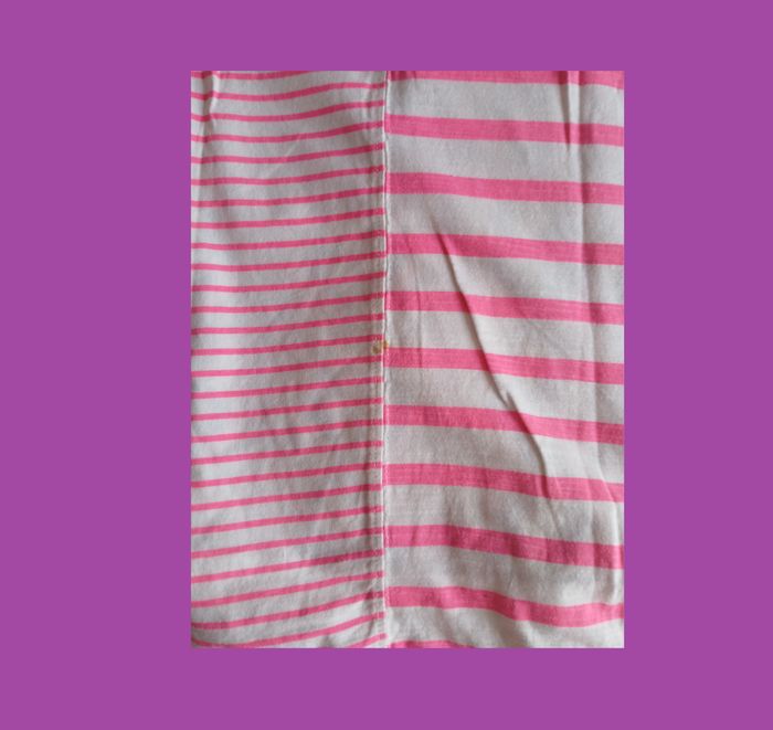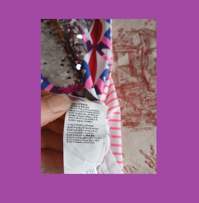 papillon avec ailes en sequins réversibles côté argent, côté rose corps du papillon brodés 2 fentes en bas sur le devant à 5 cm de chaque bord dos rayures rose et blanc, larges et étroites 99 % coton 1 % elastanne un peu plus long au dos que devant made in India