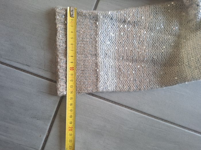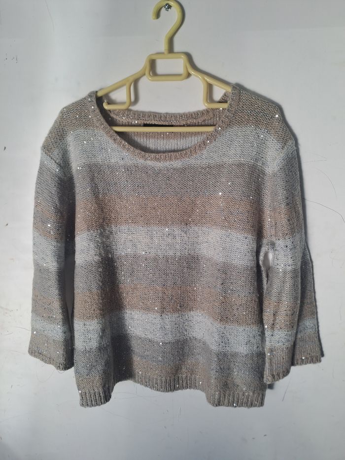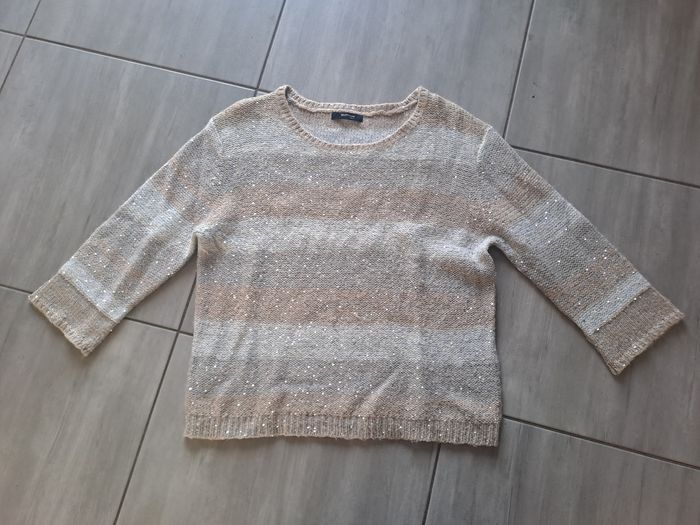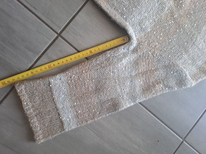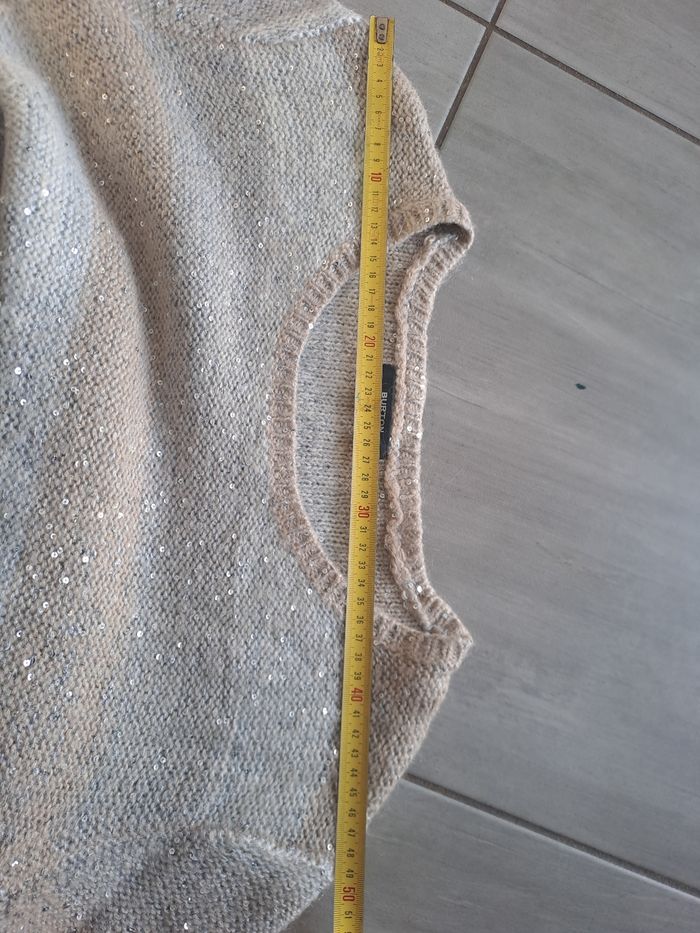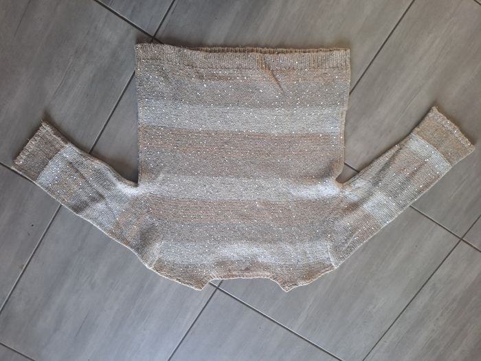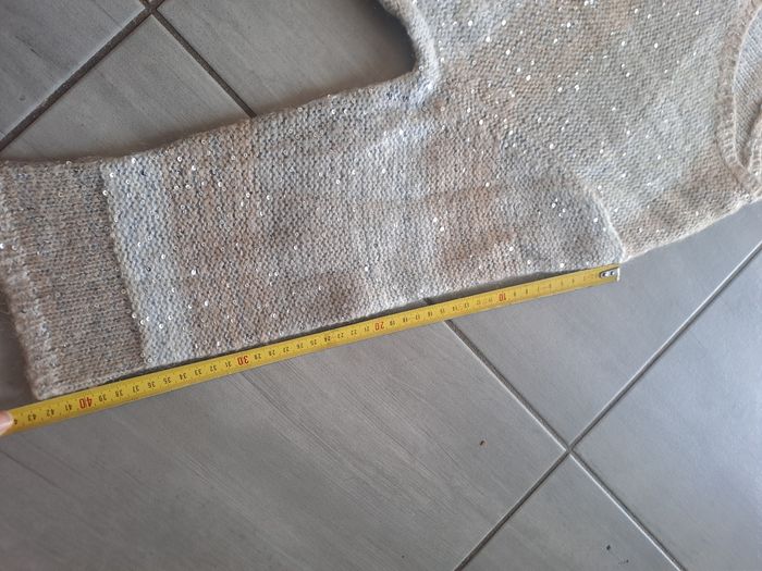 Pull Manches 3/4 pouvant se retrousser Col rond Pull brillant grâce à ses sequins Couleur Beige Gris Marron Pas d'étiquette de taille (mesure en photo) Marque Burton