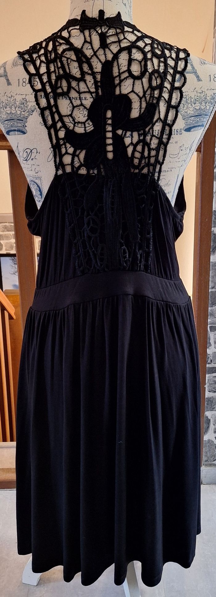 Robe fluide sans manches très élasthanne de hauteur 100 cm. La taille est marquée. Le col est rond. Tout le dos est en dentelle ajourée.