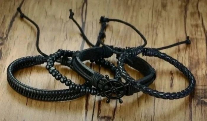 Gouvernail Bracelet en cuir, perles en bois Taille ajustable grace aux noeuds coulissants Quantité : 4 pièces / ensemble Couleur: noir Dimensions de la Barre: L 2 x H 3cm Poids: 24g État : Neuf, jamais servi