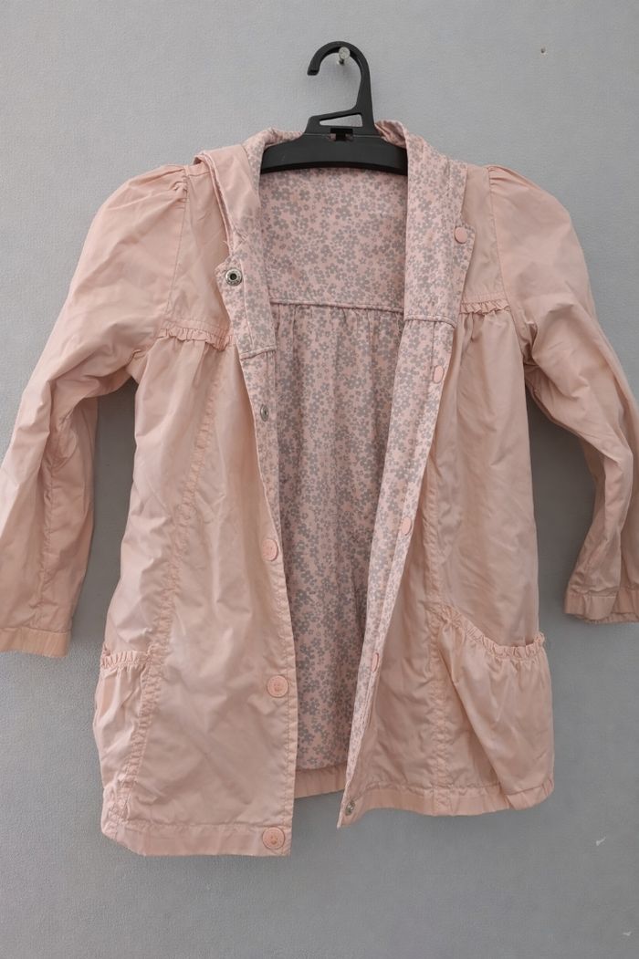 Couleur : Rose pastel avec doublure et détails à motifs petites fleurs grises/lavande. Détails : * Capuche intégrée avec doublure fleurie. Fermeture par boutons-pression sur le devant. Deux poches avant avec liseré froncé. Détail original : une grande poche zippée au dos avec un motif cœur fleuri, permettant éventuellement de replier la veste sur elle-même. État : Bon état général. Quelques plis dus au stockage. Style : Parfait pour la mi-saison ou les sorties pluvieuses légères.