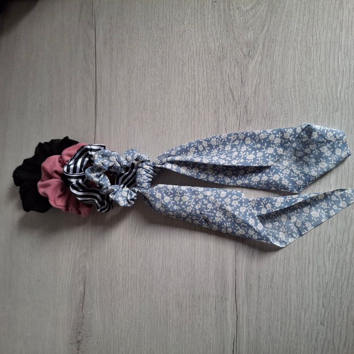 jours 🛍️Le lot est composé de: ➢1 chouchou noir style organza ➢1 chouchou rose en tissu ➢1 chouchou rayé noir et blanc effet satiné ➢1 chouchou fleuri en tissu avec rubans longs, idéal pour un look élégant ou bohème 🧼Chouchous propres et lavés, en très bon état. 🚚 Envoi rapide et soigné. 🛒 Réduction si achat en lot (3 articles - 10% )
