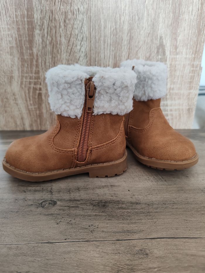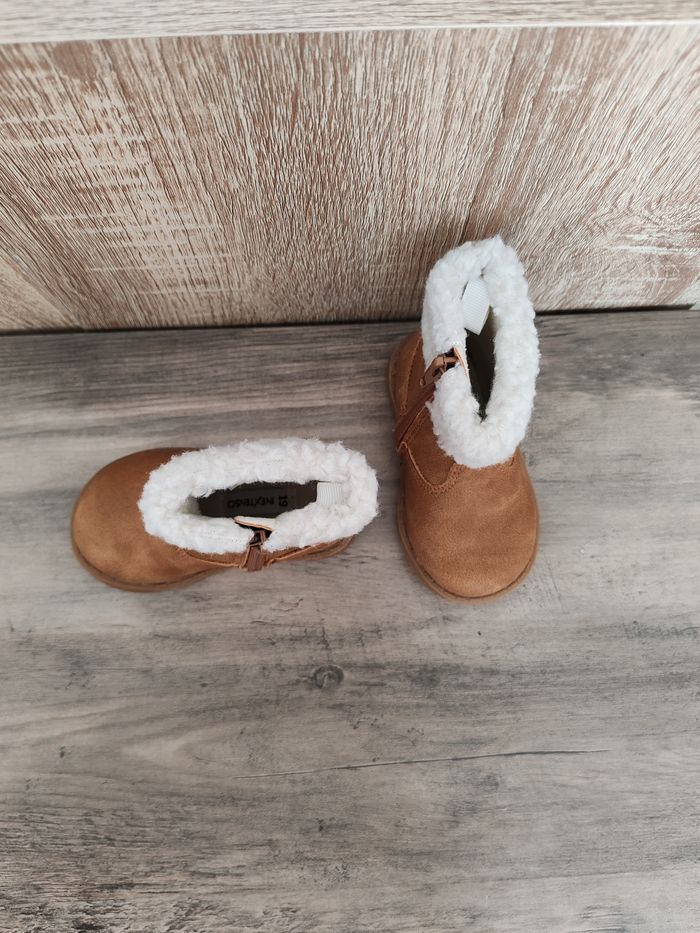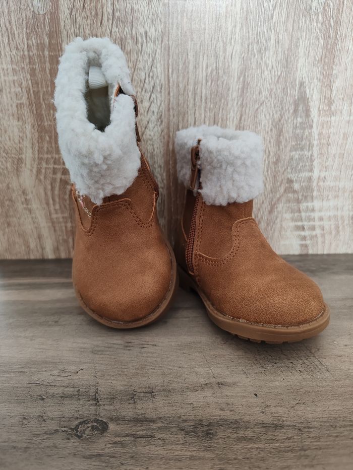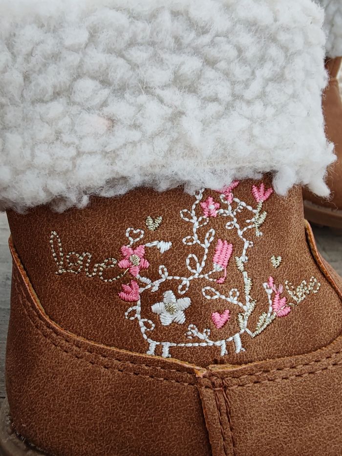 Bottines marron clair en daim marron clair, avec broderie fleuris sur le côté, revers en moumoute blanche, ouverture par zip sur le côté. In extenso, taille 19, très bon état.