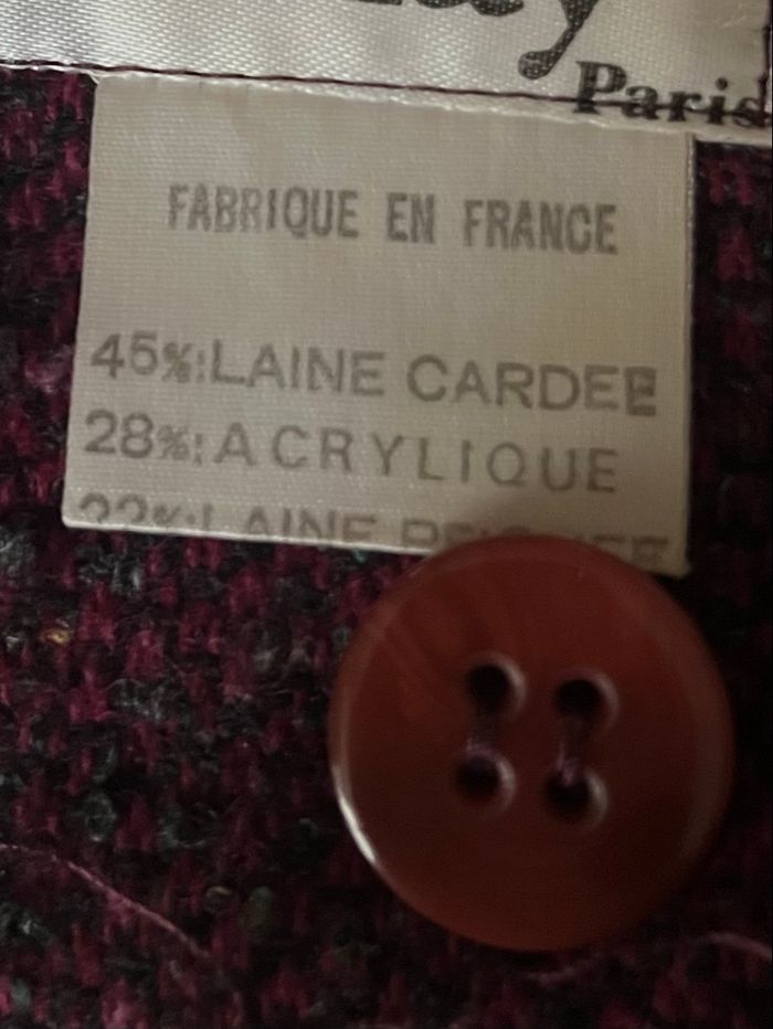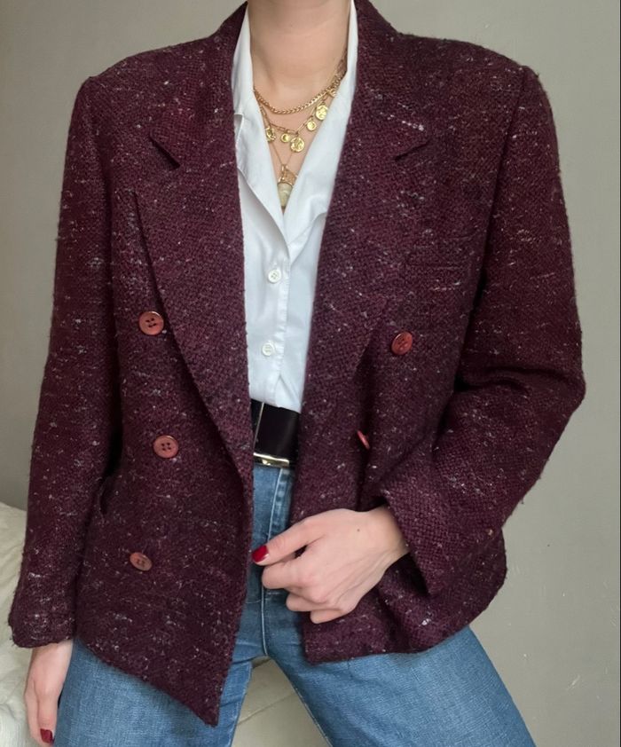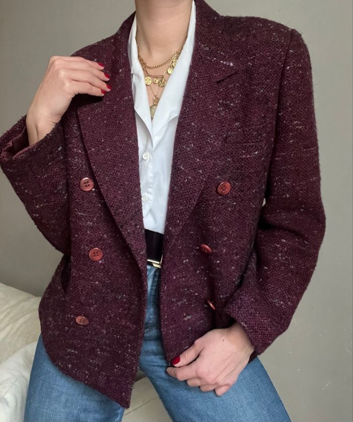 🧥 Blazer vintage et oversize, coupe courte, fermeture boutons croisés, burgundy / bordeaux / prune / plum / violet / lie de vin violacé, moucheté / chiné style tweed multicolore : beige / jaune, blanc et turquoise 🪡 45% laine cardée, 28% acrylique, 22% laine peignée et 5% viscose 🇫🇷 Made in France ℹ️ Coupe pouvant convenir du S au petit L #vintage #vintageblazer #wool #woolblazer #burgundy #burgundyblazer #plum #plumblazer #autumncolors #springcolors #tweed #tweedblazer #vintagechic #chic #oldmoney