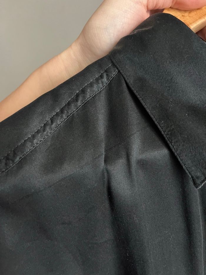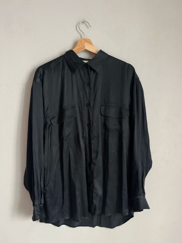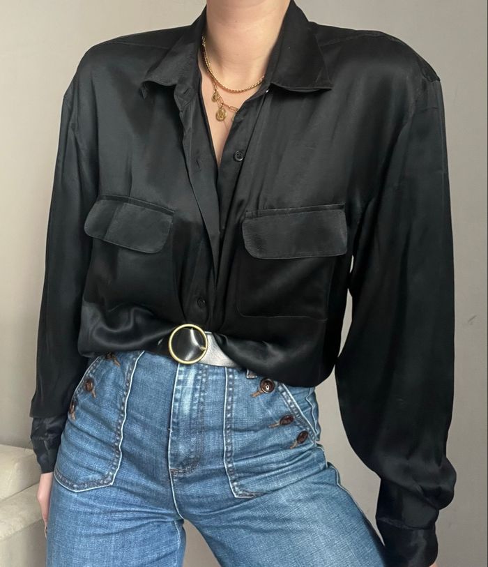 👔 Chemise manche longue, vintage et oversize, manche bouffante / manche ballon, fluide, soyeuse et légère, détail poche poitrine, uni noire, effet satiné / brillant 🪡 100% soie ℹ️ Coupe pouvant convenir du S au XL ⚠️ Fil tiré, peu visible (voir dernière photo) #vintage #vintageshirt #silk #silkshirt #oldmoney #chic #vintagechic #chicshirt #basic #minimalist #intemporel #capsulewardrobe