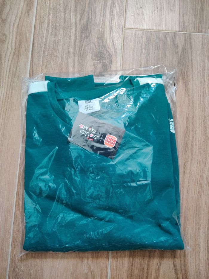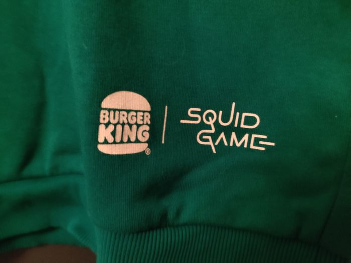 Pull vert Squid Game/Burger King neuf avec étiquette dans son emballage et non ouvert. La photo sur cintre c'est un autre pull c'est pour se rendre compte du vêtement. #squidgame #burgerking