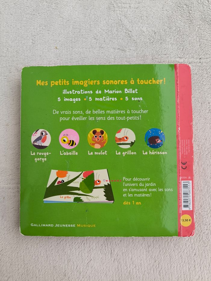 Livre sonore à toucher dysfonctionnel Mes petits imagiers sonores : Mon jardin Éditions Gallimard Jeunesse Musique À partir d'1 an • Pages cartonnées • 5 matières à toucher, 5 sons -> Rouge gorge, abeille, mulot, grillon, hérisson • Hérisson abîmé • Coins et arêtes abîmés ⚠️ D'autres livres dans la même collection Ne fonctionne plus En état satisfaisant #evelyne_livres