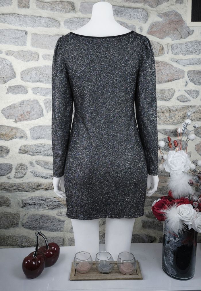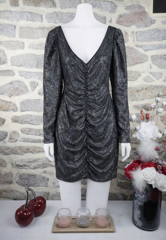 Robe de soirée scintillante nuit glamour argenté Femme taille 52 marque Asos ✴️ Décolleté en V ✴️ Manches longues ✴️ Épaules froncées ✴️ Drapé froncée flatteur camouflant subtilement les imperfections et sublimant les courbes ✴️ Couleurs => Noir et argenté parsemé de fils brillants ✴️ Composition -> 79 % polyester 8 % elastanne 13 % fibres métallisées ✴️ Longueur => 101 centimètres ✴️ Mesure épaules à épaules => 38,6 centimètres ✴️ Tour de poitrine -> 113 centimètres