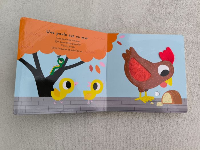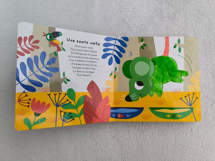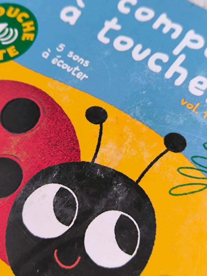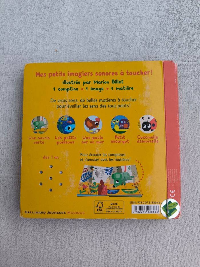 Livre sonore à toucher Mes petits imagiers sonores : Mes comptines à toucher, volume 1 Éditions Gallimard Jeunesse Musique À partir d'1 an • Pages cartonnées • 5 matières à toucher, 5 sons -> Une souris verte -> Les petits poissons -> Une poule sur un mur -> Petit escargot -> Coccinelle, demoiselle • Intérieur du livre en très bon état • Coins, arêtes et couvertures abîmés ⚠️ D'autres livres dans la même collection Fonctionne Piles incluses En bon état #evelyne_livres