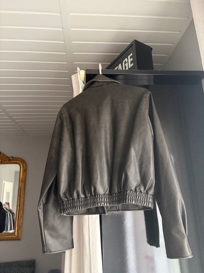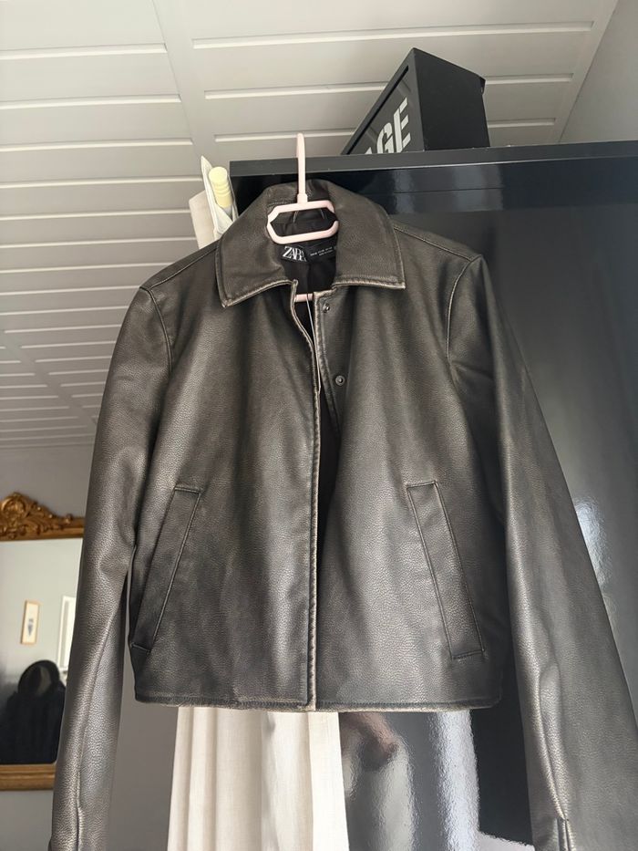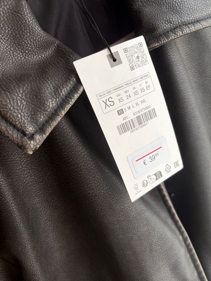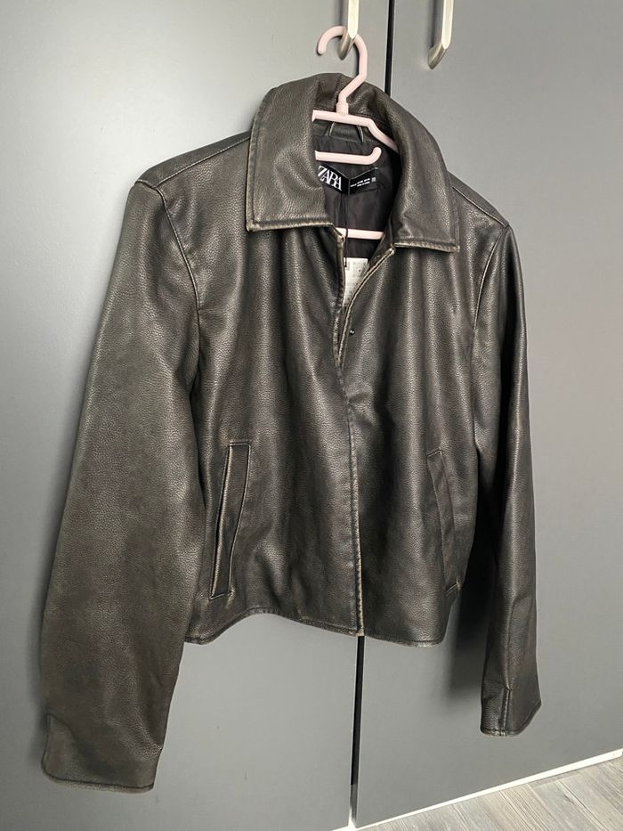 Veste faux cuir grainé marron très foncé Zara (Je la vois marron très foncé mais elle était vendue sur le site avec la couleur noire d’indiquée) : se référer à la couleur des photos; elles ont été prises à la lumière naturelle pour un rendu au plus proche de la réalité ! Taille XS / La coupe n’est pas cintrée Neuve avec étiquette Référence de l’article : 6318/273/800 Les mesures (également présentes sur les photos) : Longueur du dos sans le col : 52cm Longueur manche : 61cm Épaule à épaule : 43cm