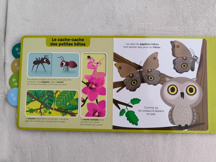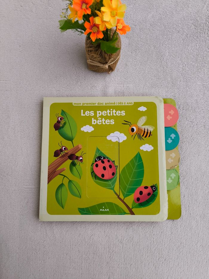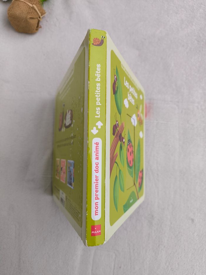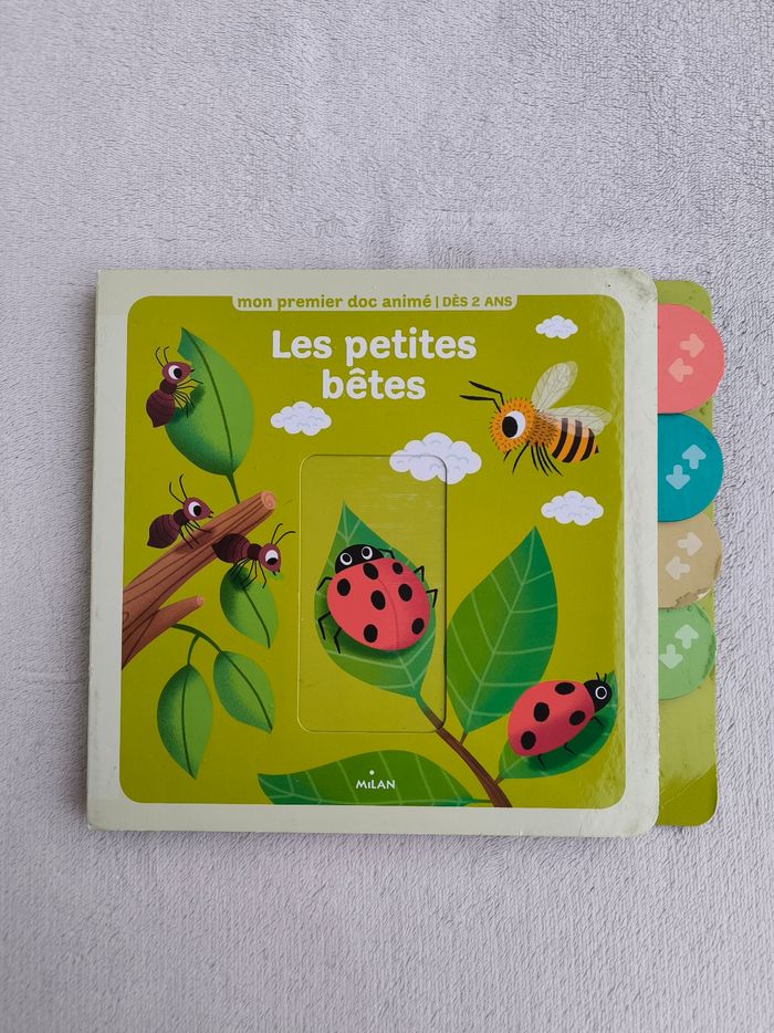 Livre animé Mon premier doc animé : Les petites bêtes Éditions Milan À partir de 2 ans • Pages cartonnées • Tirettes -> Les petites bêtes se déplacent : limace, mille-pattes, scarabée... -> Les petites bêtes se défendent : guêpe, scorpion... -> Les bébés des petites bêtes : mouche, araignée, abeille... -> Les maisons des petites bêtes : araignée, chenille... -> Le cache-cache des petites bêtes : fourmi, phasme, papillon... • Intérieur du livre en très bon état • Dernière tirette déchirée/enlevée (peut se glisser avec les doigts) En bon état #evelyne_livres