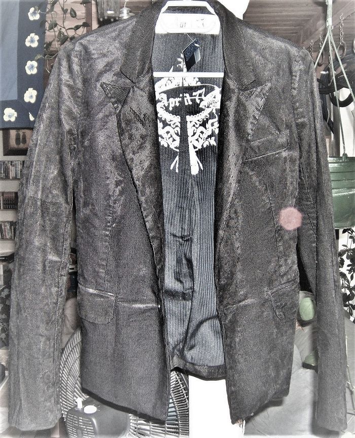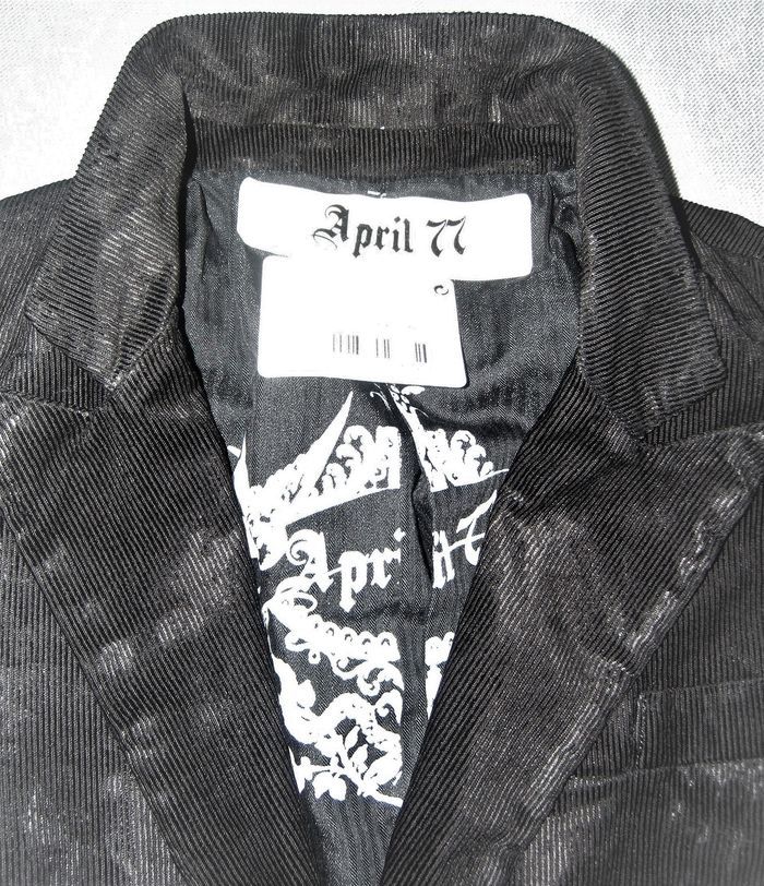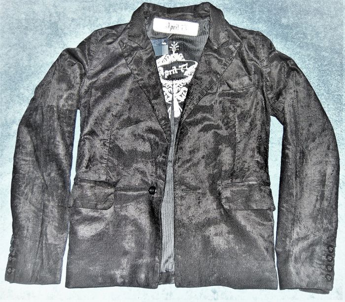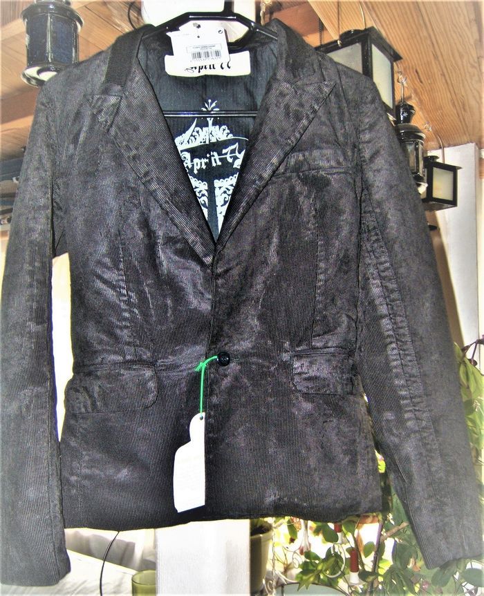 Veste "April 77", modèle veste tailleur mixte, en velours côtelée couleur noir, doublé, taille S (pour Homme) ou taille M (pour Femme), quasi neuve, portée 1 fois, prix définitif.