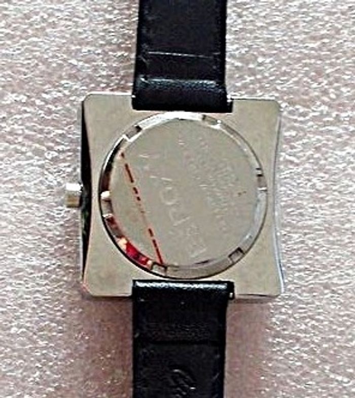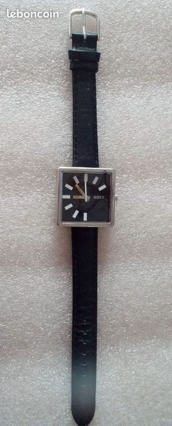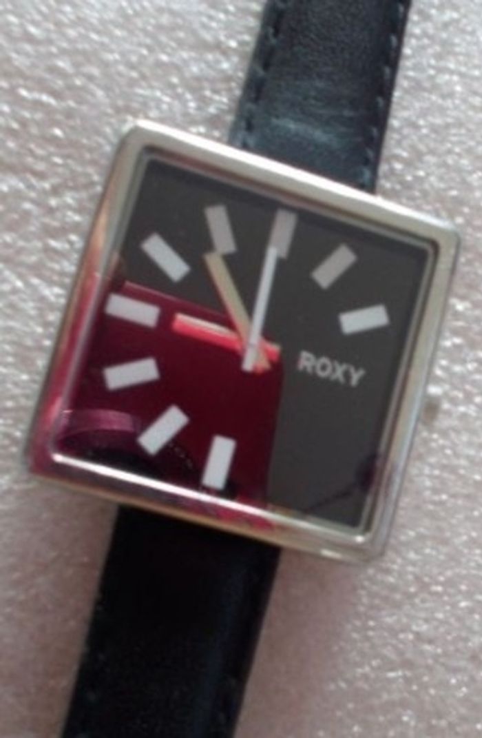 Montre ROXY "Supernova", boîtier argenté de forme carré, intérieur couleur noir, traits blancs pour les chiffres, aiguilles argent et trotteuse blanche, et bracelet en cuir couleur noir, en parfait état de fonctionnement, pile fourni, prix définitif.