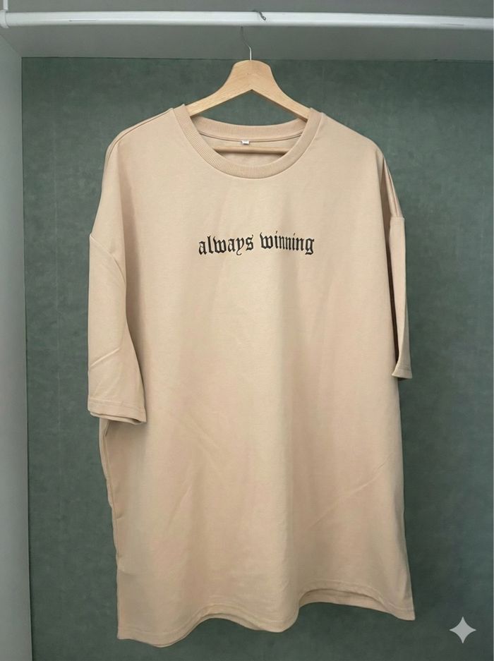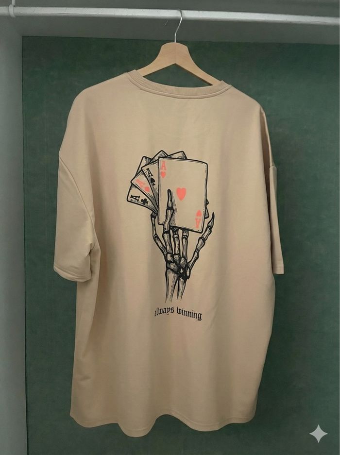 T-shirt beige coupe droite/oversize avec grand visuel dans le dos : main de squelette tenant un carré d’As et inscription « always winning », parfait pour un style streetwear/poker original. Devant minimaliste avec le texte « always winning » en écriture gothique, matière douce et confortable, idéal avec jean ou cargo pour un look urbain. Très bon état (peu porté), pas de taches ni de trous visibles, lavable en machine, prêt à être porté immédiatement.