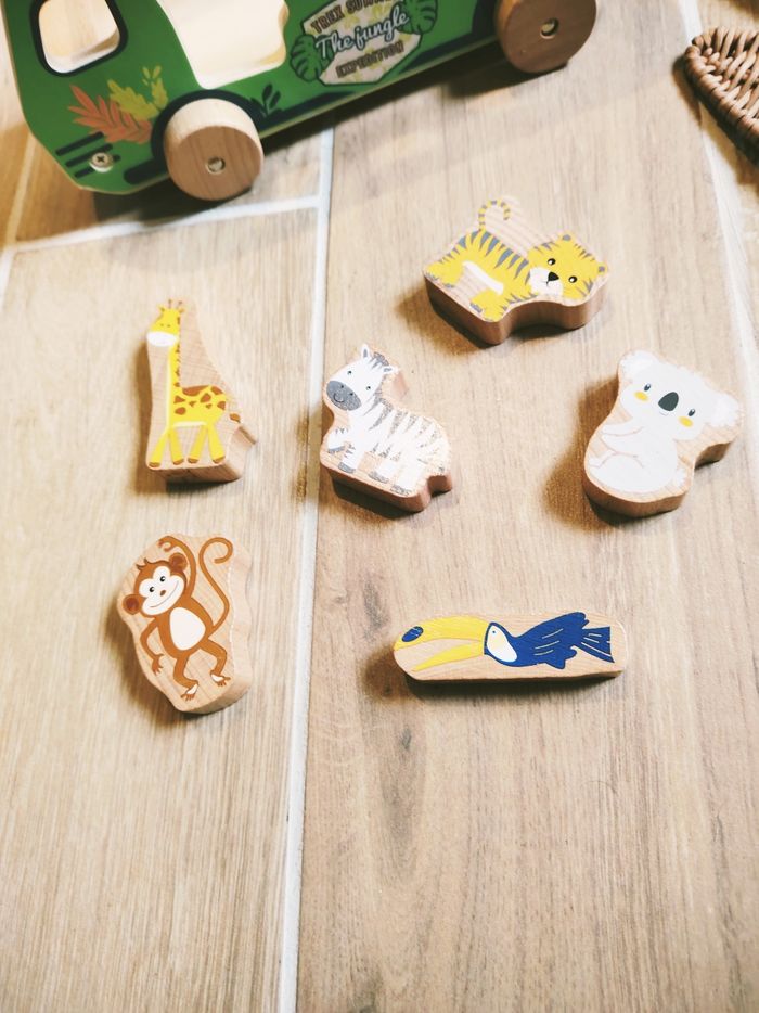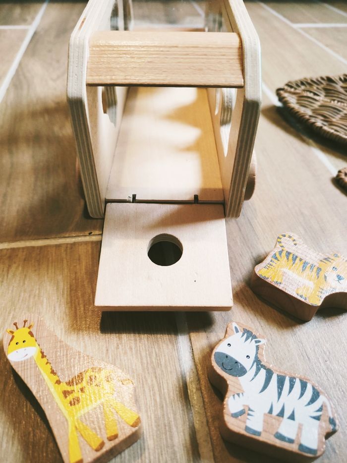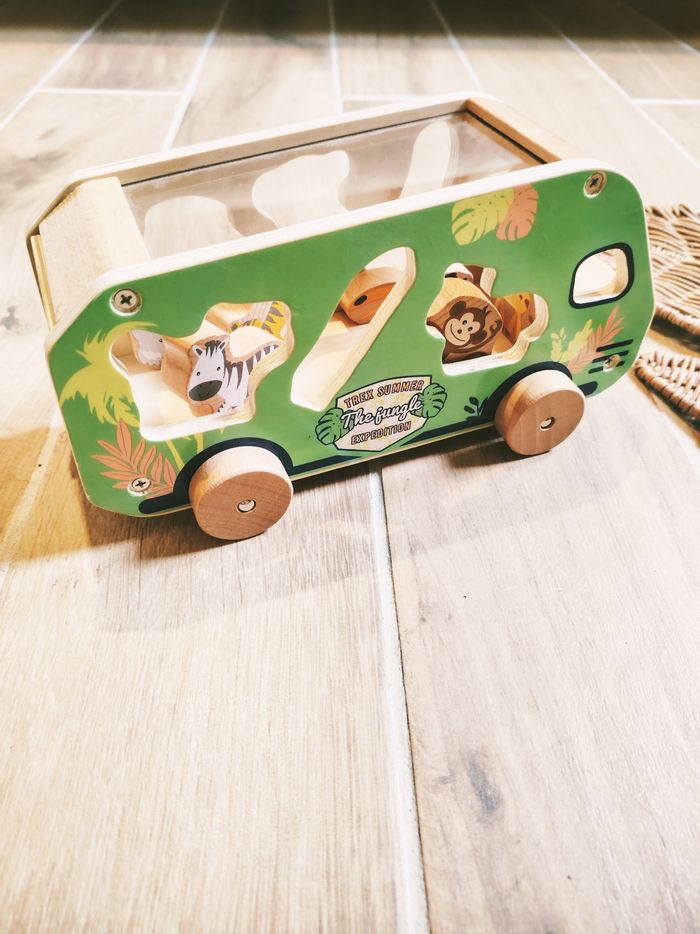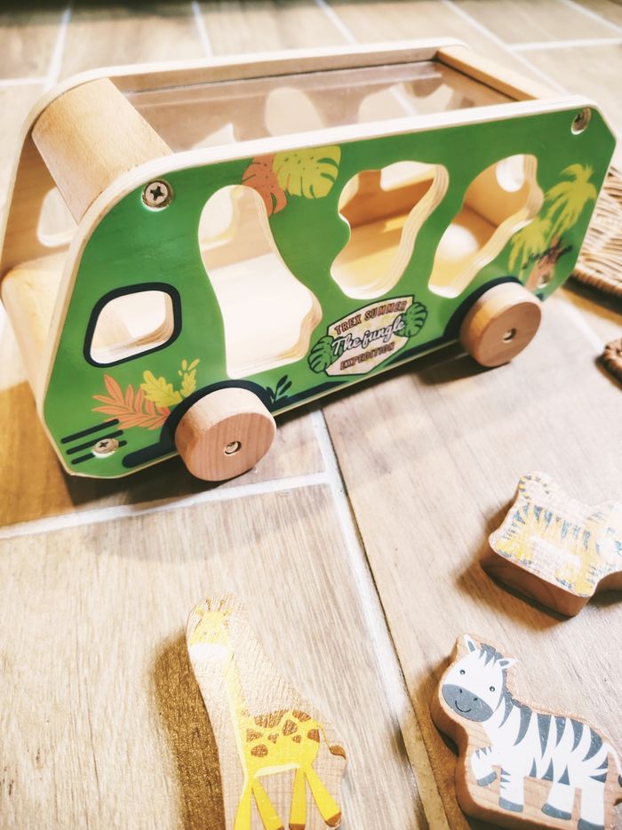 🎀En avant pour de belles histoires avec ce bus de la savane qui permettra à votre enfant de reconnaître les animaux et les encastrer au bon endroit selon la forme.