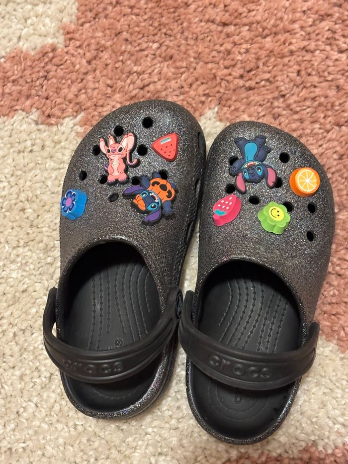 Crocs noirs paillettes noirs28/29 Excellent état Quasiment pas de trace d usage Avec des jibbitzs crocs et des pin’s Stitch autre marque Prix d origine de la totalité :50 euros
