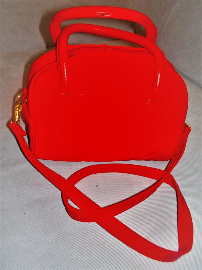 Sac à main "AnonyMC", modèle bowling à porter au bras ou en bandoulière, en tissu couleur rouge, fermeture zippé, dimensions: 21 cm x 18 cm x 14 cm, neuf.