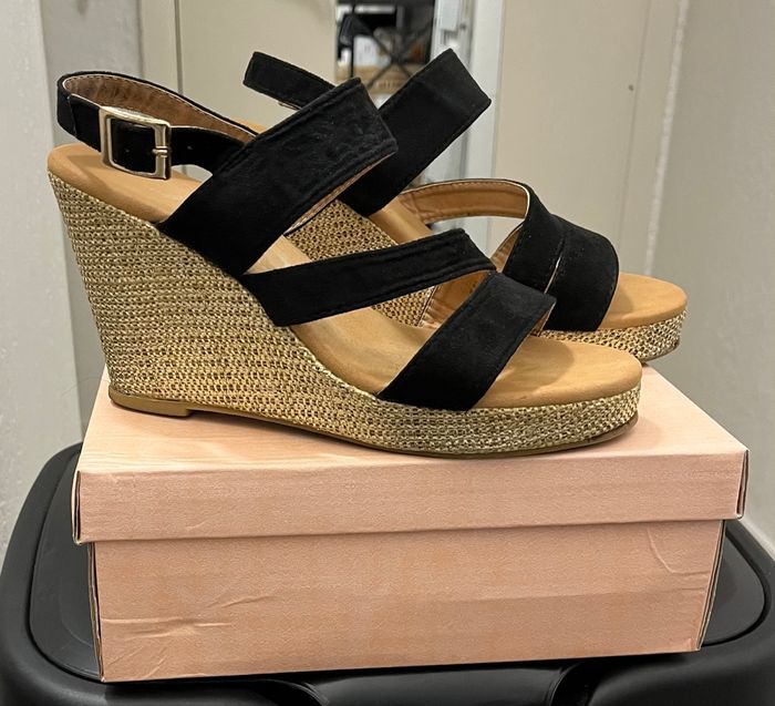 Acheté en l’état avec la tache de colle côté intérieur du pied droit Hauteur talon : 10,5cm