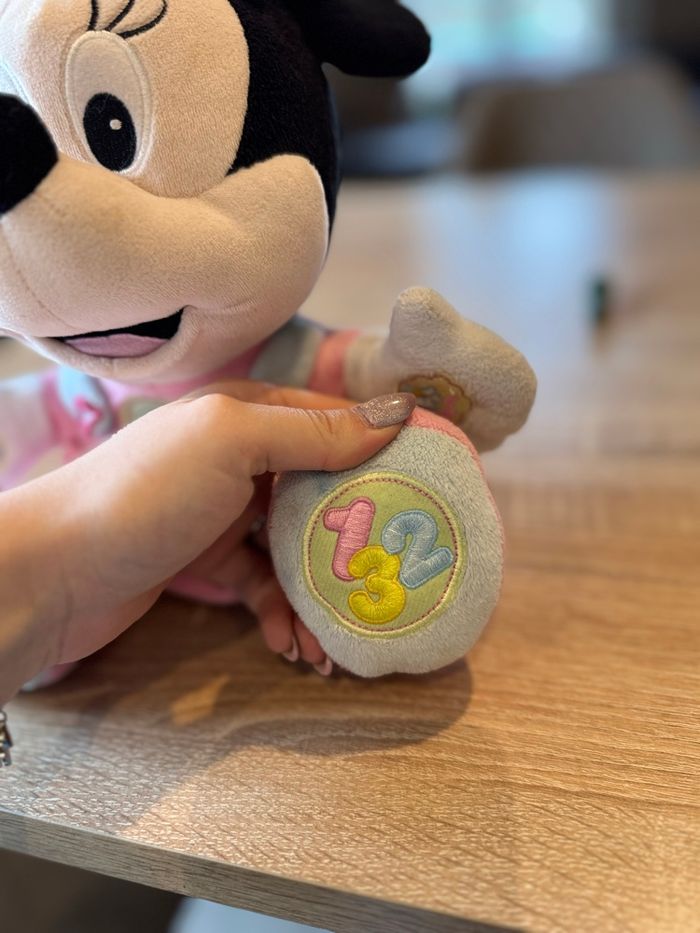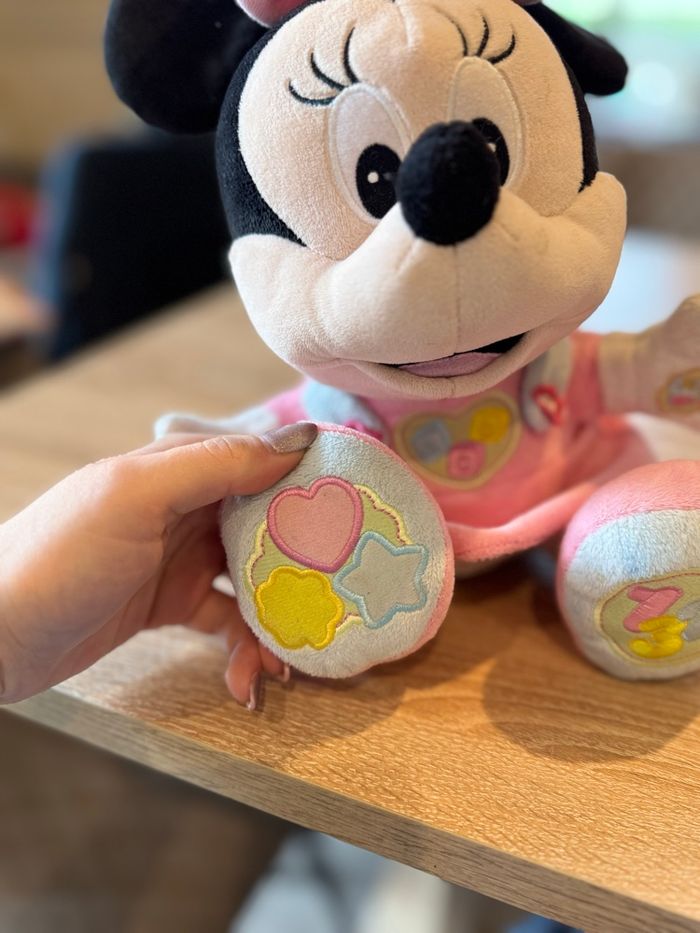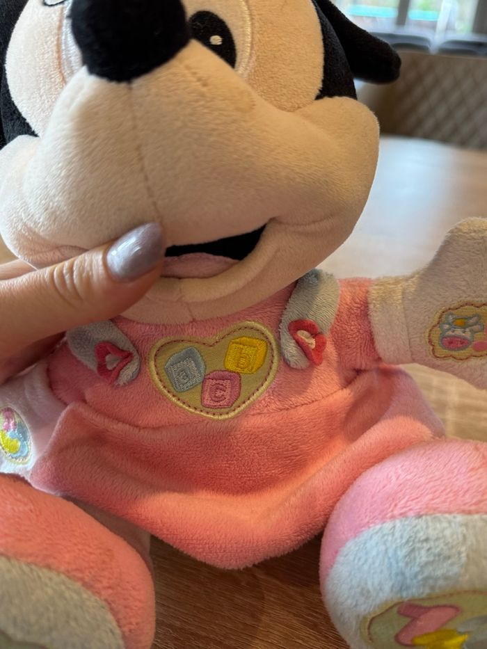 Peluche Minnie éducative. Avec 5 boutons interactifs brodés. 3 chansons et 2 chansons de berceau avec la voix originale de Baby Mickey/Minnie. Facilite le développement sensoriel, psychomoteur et émotionnel de votre bébé. En très bon état mise à part le dessous , voir photo Vendu sans piles ⚠️