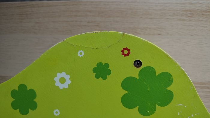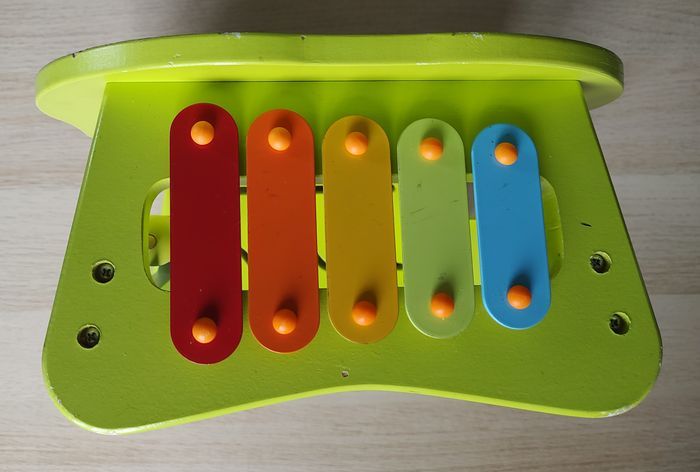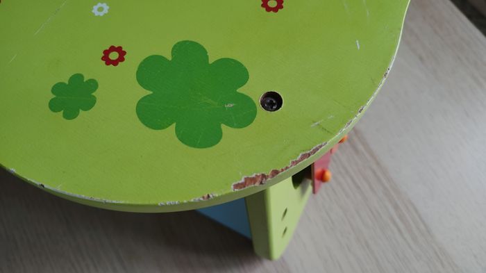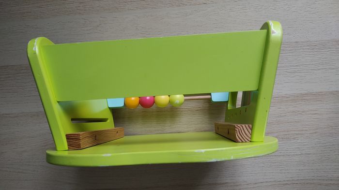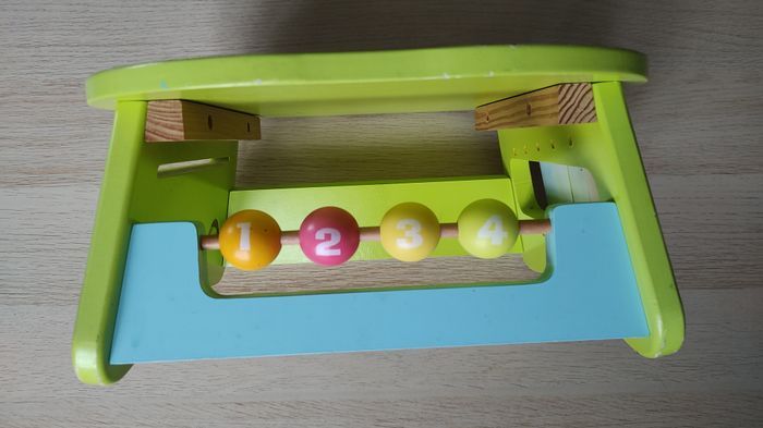 Tabouret d'activités 30 x 30 cm Boulier, fleur à déplacer et xylophone (je n' ai plus la baguette pour taper sur le xylophone). Le plateau présente quelques rayures mais n'est pas cassé.