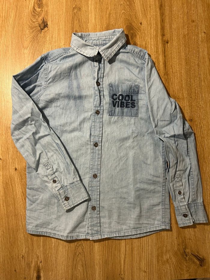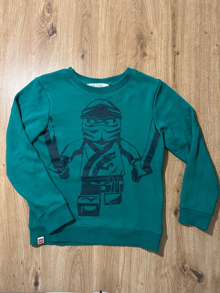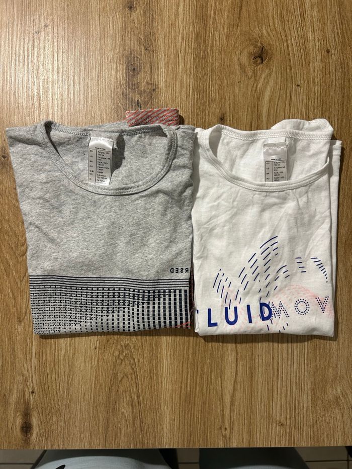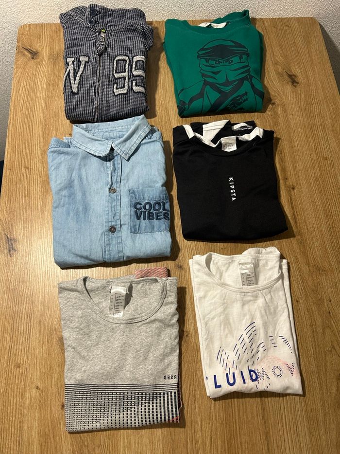Lot de vêtements garçon 8 ans - une chemise bleue - un pull Ninjago vert - un gilet gris - un t shirt gris Décathlon - un t shirt blanc Décathlon - un t shirt noir Kipsta Tout est en très bon état