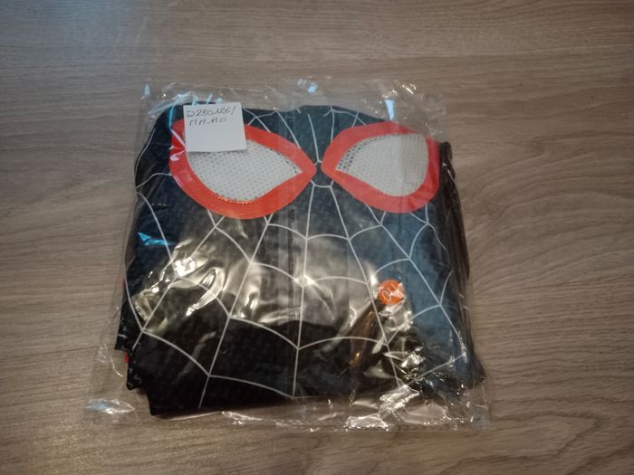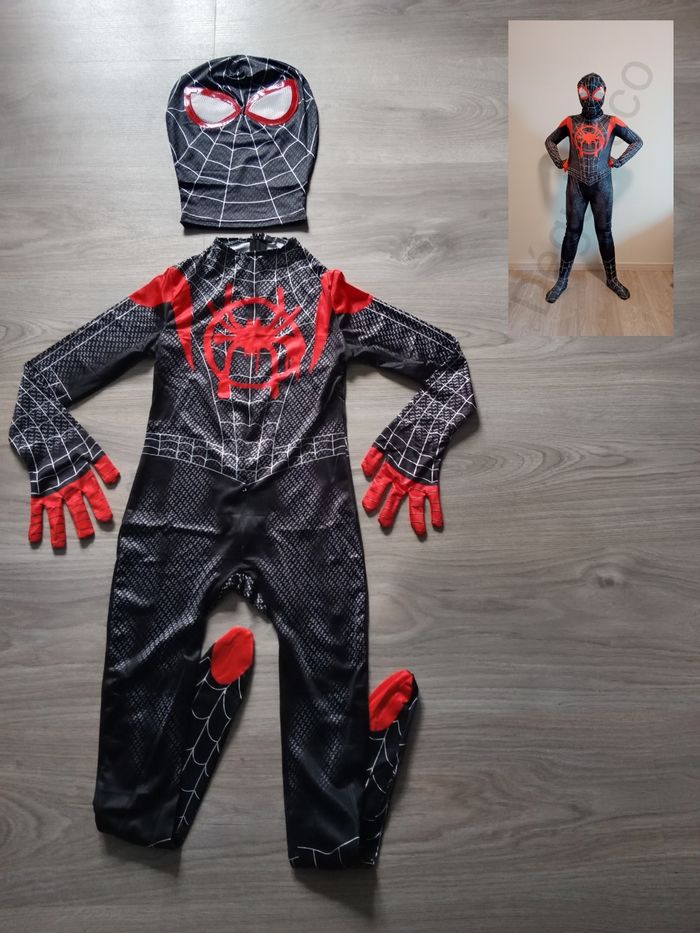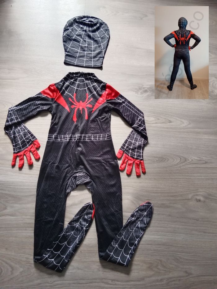 Costume inspiré Spiderman noir (Miles Morales) dans le film d'animation New generation. taille 110 (5 ans) Combinaison complète avec gants et pieds intégrés + cagoule. Fermeture dans le dos et braguette sur le devant. Matière polyester et spandex. lavage en machine à 30. Pas de sèche linge, pas de repassage.