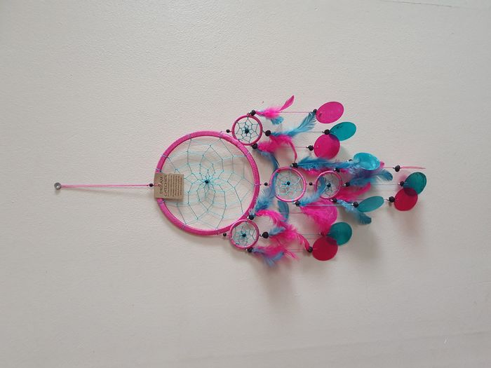 Moyen Attrape rêves rose et bleu Longueur : 60 cm Largeur : 24 cm Diamètre : 17 cm Poids : 75 grammes Fabrication artisanale Neuf avec étiquette