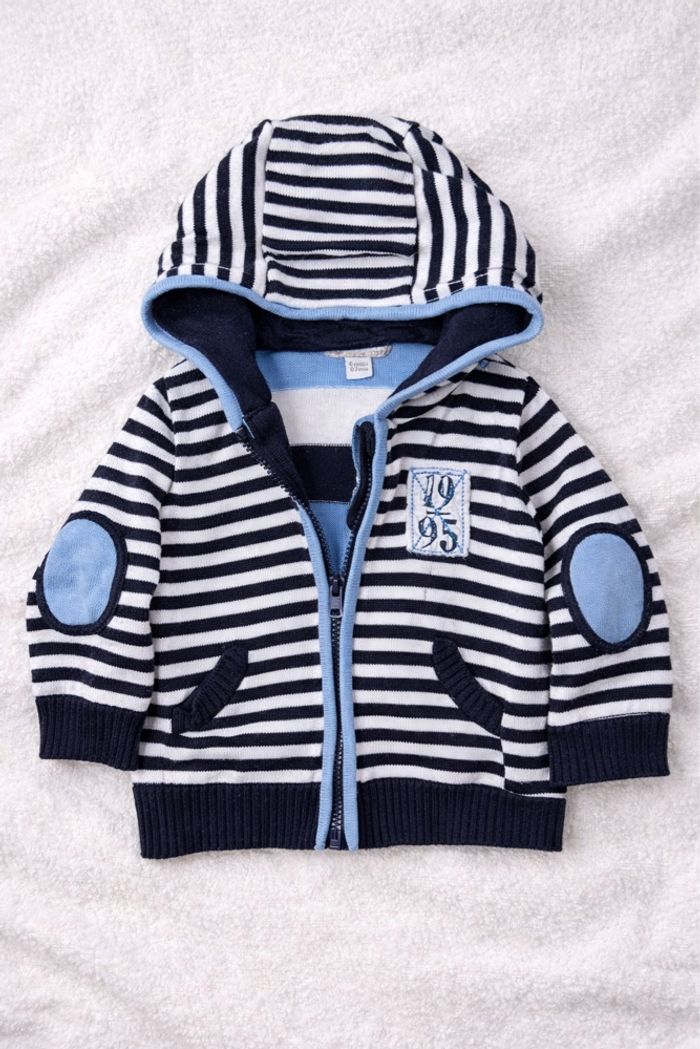 Veste bébé Orchestra taille 6 mois. 🤍💙 Rayures marine/blanc avec détails bleu clair, capuche et fermeture zippée. Petites poches devant et coudières trop mignonnes. Très bon état, peu portée, aucun défaut.