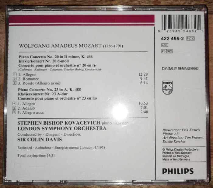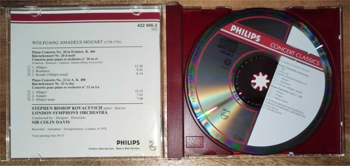 🎵 Mozart 🎵 Piano Concertos No. 20 No. 23 Réf. Philips – 422 466-2 CD 6 pistes Concerto No. 20 in D Minor, K. 466 1 - Allegro 2 - Romance 3 - Rondo (Allegro Assai) Concerto No. 23 in A, K. 488 4 - Allegro 5 - Adagio 6 - Allegro Assai .