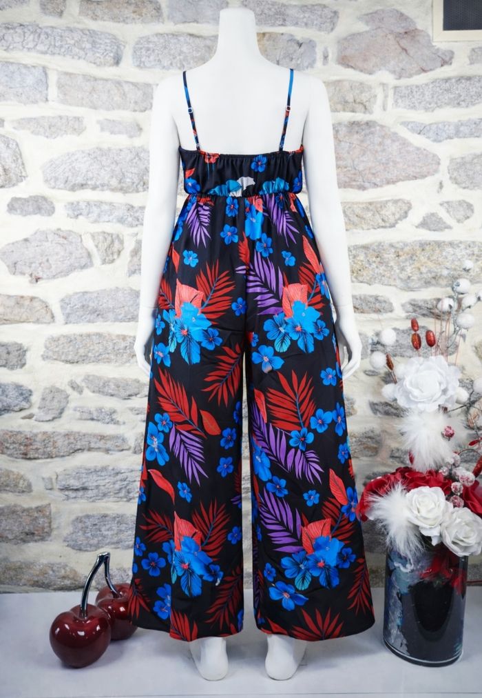 Combinaison ample voyage sous les Tropiques noire et multicolore Femme taille 54 marque Asos ✴️ Bretelles fines et réglables ✴️ Taille élastiquée froncée ✴️ Encolure V ✴️ Coupe ample , légère et confortable ornée d'un motif tropical luxuriant et moderne. Sur un fond noir se déploient des feuilles de palmier et des fleurs dans des teintes vives de bleus (turquoise, outremer), de rouge corail, et de violet lavande. ✴️ Composition => 100 % polyester ✴️ Longueur => 141,5 centimètres ✴️ Longueur entrejambe => 73,4 centimètres ✴️ Tour de poitrine => 104 centimètres ✴️ Tour de taille => 104 à 142 centimètres