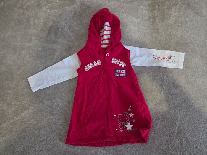 Le lot comprend : - 28 t-shirts ml - 2 tuniques - 8 bodies ml - 6 robes - 2 jupes - 1 ensemble pantalon + veste kiabi - 1 ensemble tunique à capuche + t-shirt hello kitty - 1 veste rose assez chaude - 1 doudoune chaude - 1 veste sans manches - 1 pyjama 2 pièces - 1 robe de chambre douce Idéal automne / hiver