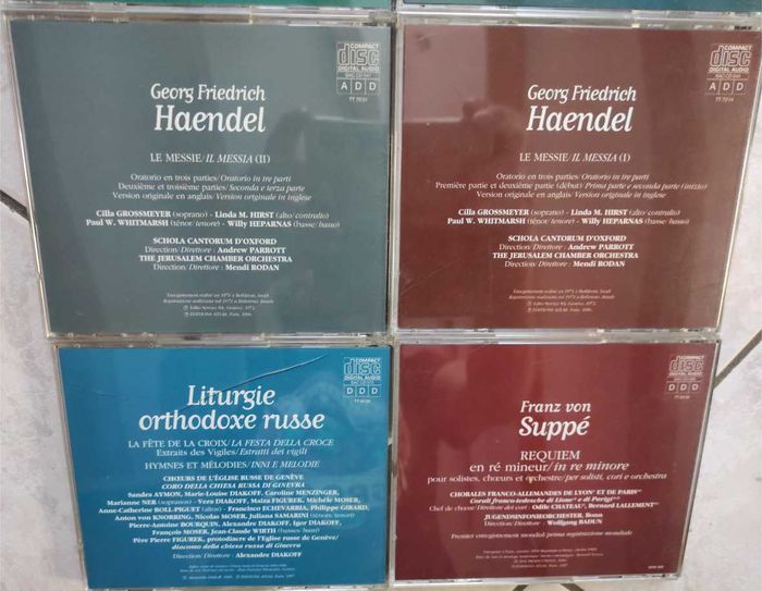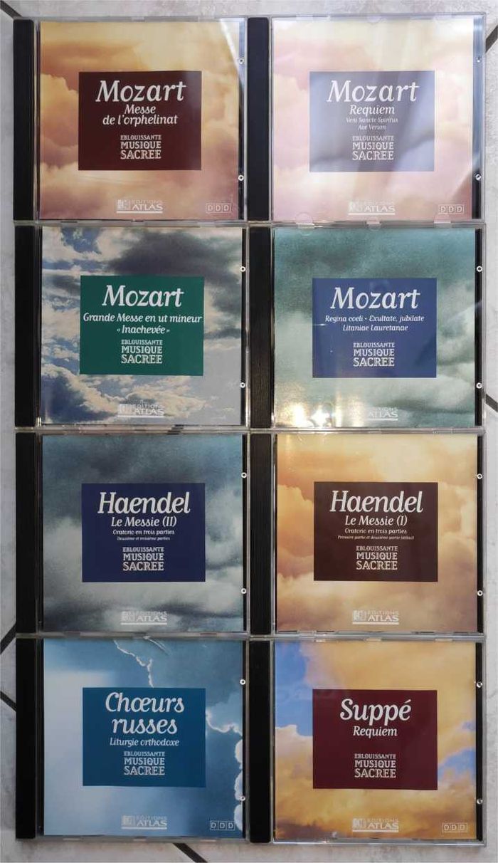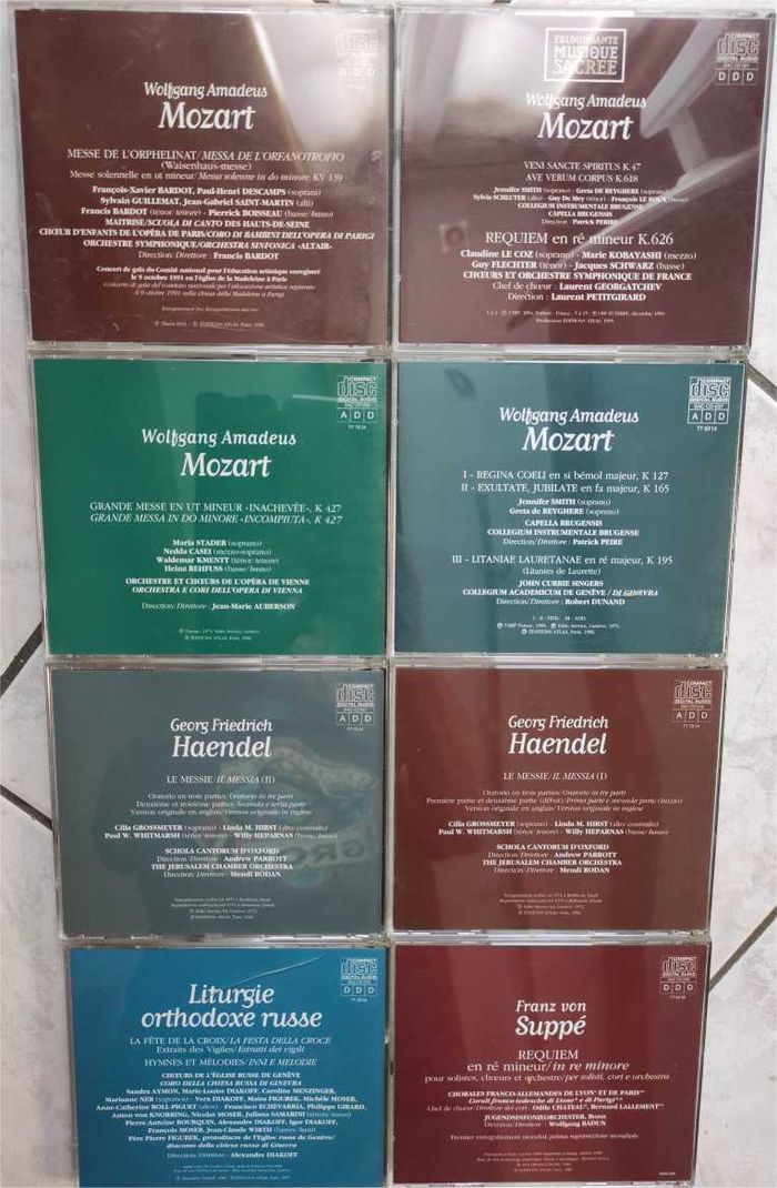 🎵 Georg Friedrich HAENDEL 🎵 Wolfgang Amadeus MOZART 🎵 Franz von SUPPE 🎵 Choeurs Russes Lot de 8 CD Collection "Eblouissante Musique Sacrée" des Editions Atlas (années 1996-1997) Georg Friedrich HAENDEL CD n°046 dans la collection - Le Messie (I) Georg Friedrich HAENDEL CD n°047 dans la collection - Le Messie (II) Wolfgang Amadeus MOZART CD n°001 dans la collection - Veni Sancte Spiritus K.47 - Ave Verum Corpus K.618 - Requiem en ré mineur K.626 Wolfgang Amadeus MOZARTCD n°029 dans la collection - Grande Messe en ut mineur "inachevée" K.427 Wolfgang Amadeus MOZART CD n°037 dans la collection I - Regina Coeli en si bémol majeur K 127 II - Exultate, Jubilate en fa majeur K165 III - Litaniae Lauretanae en ré majeur K195 Wolfgang Amadeus MOZART CD n°051 dans la collection - Messe de l'Orphelinat Franz von SUPPE CD n°035 dans la collection - Requiem en ré mineur Choeurs Russes CD n°036 dans la collection Liturgie orthodoxe russe - La fête de la Croix - Hymnes et Mélodies .