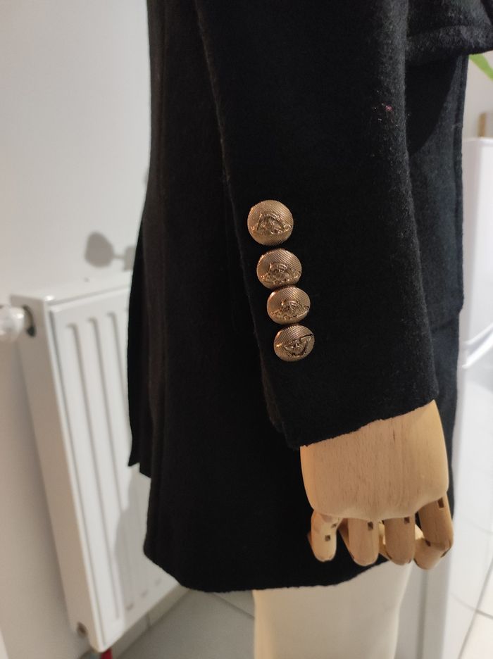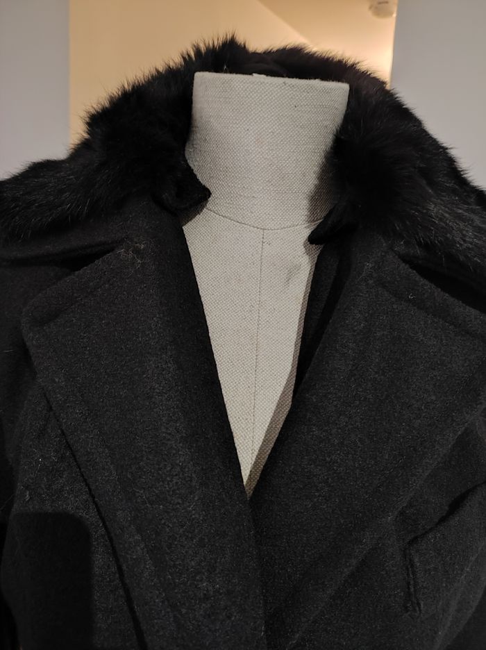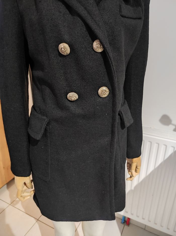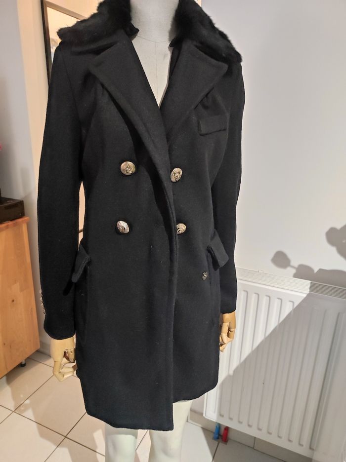 Manteau chaud pour l'hiver neuf Col revers Partie fausse fourrure amovible Marque: Sweewë Coupe classique Manches longues avec boutons dorés 75%polyester 25%elasthane Doublure 100%polyester Poches bilatérales (vraies) Longueur manches 62 Longueur totale 84cm Fermeture boutons Couleur noir
