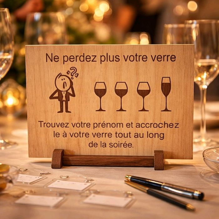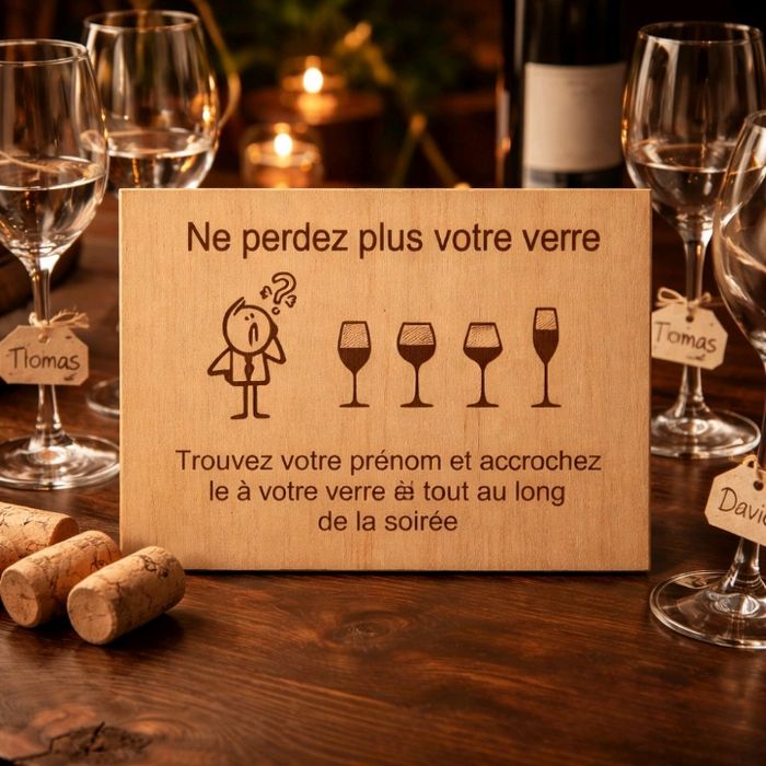 Affiche en bois au format A4, élégante et pratique, conçue pour guider vos invités avec douceur. Le bois, naturel et chaleureux, ajoute une touche authentique à votre décoration. Sur cette affiche, un message délicatement gravé ou imprimé invite les convives à prendre leur gobelet et à y attacher une petite épingle à leur nom afin de ne pas le perdre. Placée près du bar ou du buffet, cette affiche devient un repère utile et esthétique qui facilite l’organisation tout en ajoutant une touche de convivialité. Un détail à la fois décoratif et fonctionnel pour rendre votre événement encore plus fluide et chaleureux. Chaque affiche est unique et fabriquée avec un matériau naturel. L’article peux présenter des défauts visuel comme des rainures ou des noeuds. Chevalet en suppléant pour 2e
