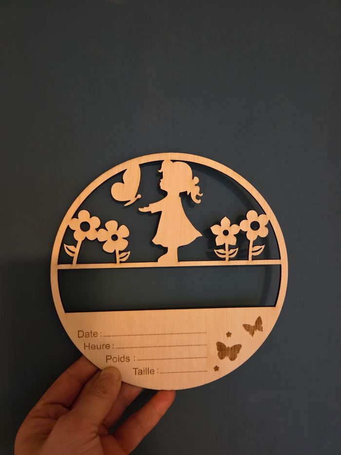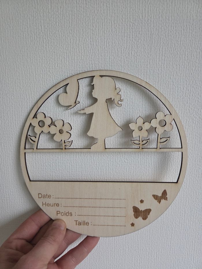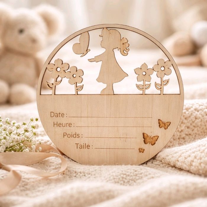 🌼 Plaque naissance en bois – Souvenir personnalisé bébé Immortalisez un moment unique avec cette jolie plaque de naissance en bois, au design tendre et poétique. Finement découpée, elle représente une petite fille entourée de fleurs et de papillons, symbole de douceur et de nouveauté. Cette plaque décorative permet d’inscrire les informations de naissance de bébé : 📅 Date – ⏰ Heure – ⚖️ Poids – 📏 Taille Un souvenir précieux à conserver ou à offrir. Parfaite pour une décoration de chambre, un cadeau de naissance, un baptême ou une baby shower, elle apporte une touche naturelle et chaleureuse à l’univers de bébé. ✨ Caractéristiques : 🪵 Bois naturel au rendu doux et élégant 🌸 Motif délicat fille, fleurs et papillons ✍️ Espaces prévus pour les détails de naissance 🎁 Idéal comme cadeau personnalisé 🤍 Style poétique, minimaliste et intemporel Un objet plein d’émotion qui raconte les premiers instants de vie avec tendresse.