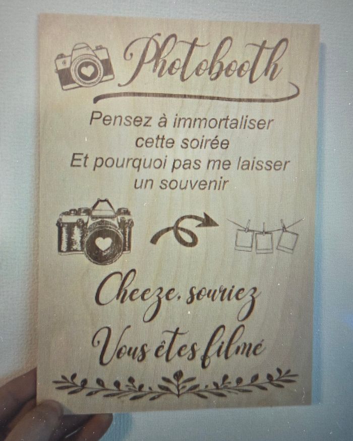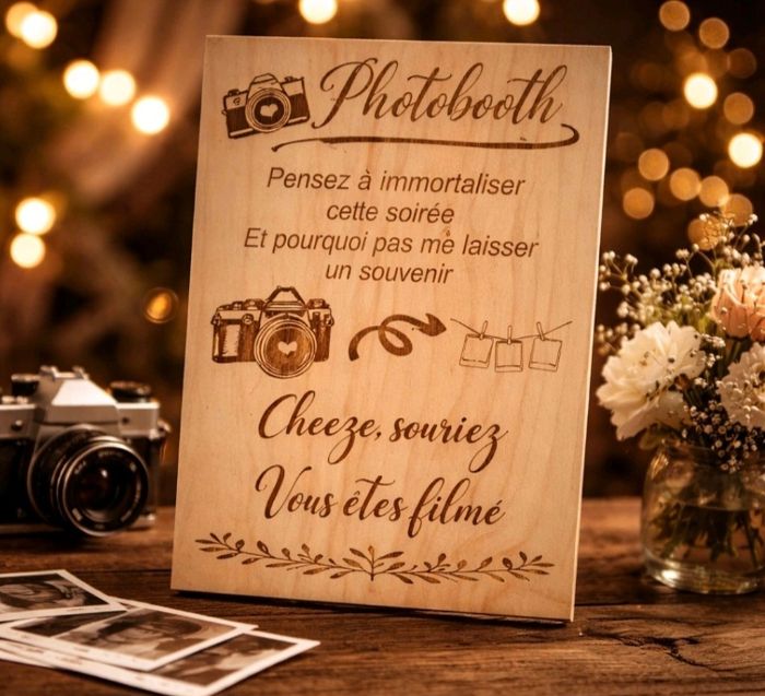 Affiche en bois au format A4, gravée avec soin pour ajouter une touche ludique et festive à votre espace photo. Son bois naturel, avec son grain délicat et ses nuances chaleureuses, apporte une touche élégante qui s’intègre parfaitement à l’ambiance de votre événement. Le message gravé, clair et convivial, invite vos convives à se prêter au jeu des clichés, avec ou sans accessoires. Placée à proximité du coin photo, sur un chevalet ou joliment intégrée à la mise en scène, cette affiche devient un repère visuel qui incite vos invités à immortaliser leur présence avec un brin de fantaisie. Elle transforme chaque instant capturé en un souvenir précieux de votre événement. Chaque affiche est unique et fabriquée avec un matériau naturel. L’article peux présenter des défauts visuel comme des rainures ou des noeuds. Chevalet en suppléant pour 2e