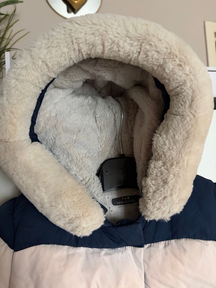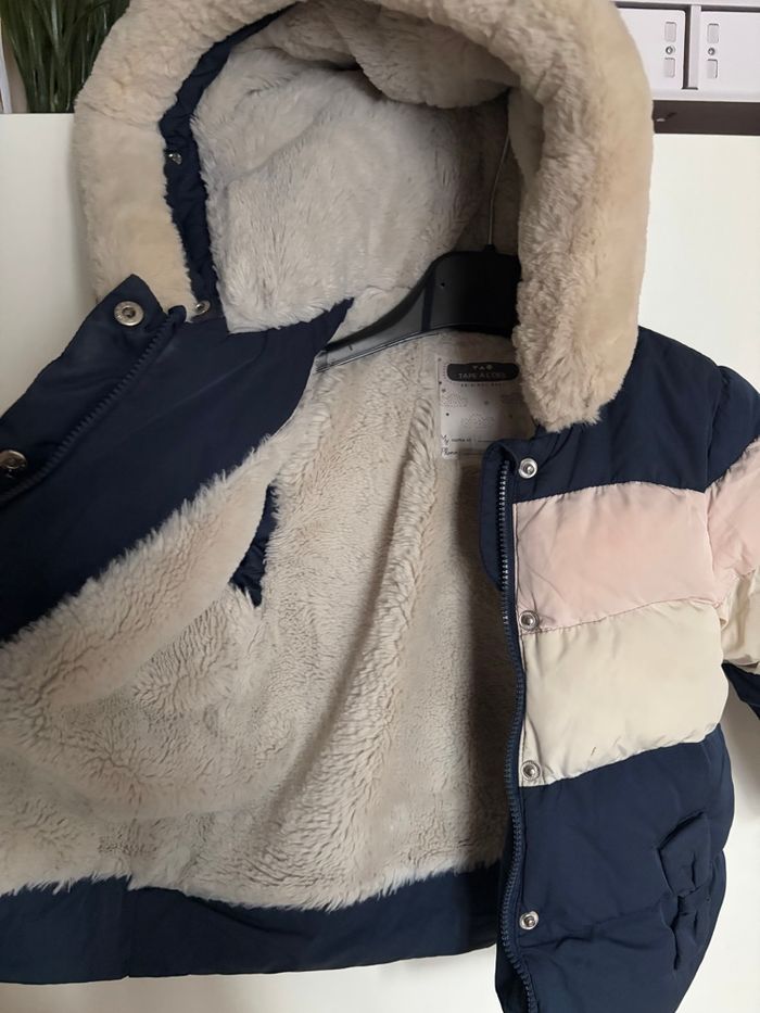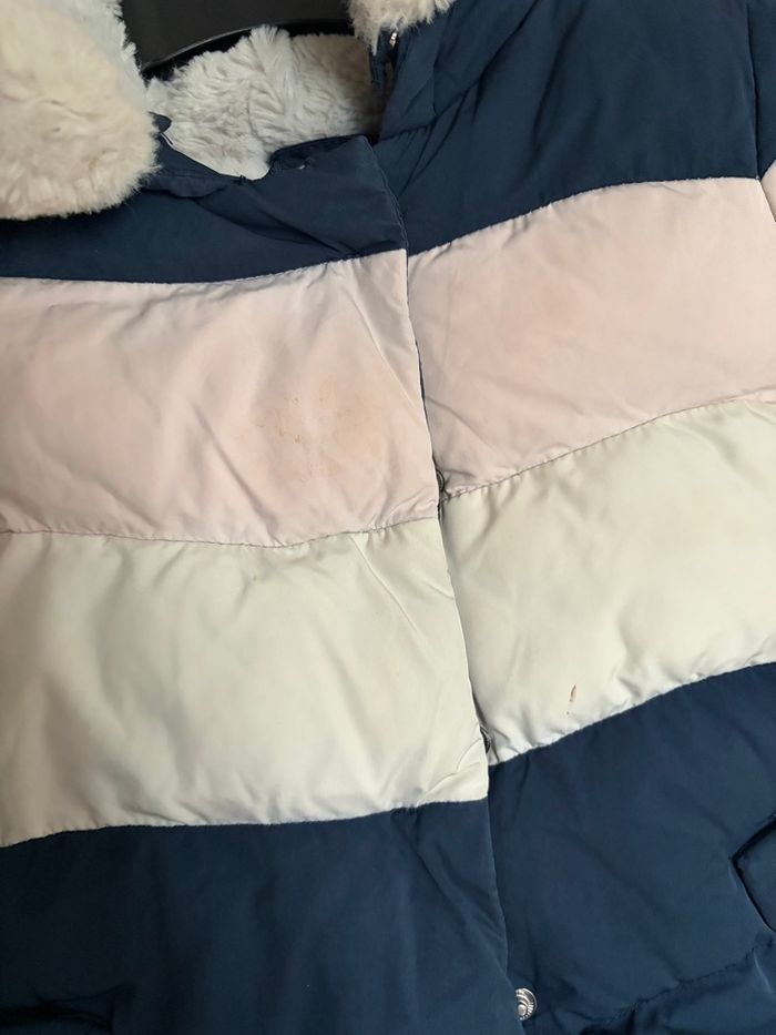 manteau chaud - doudoune fille 🎀 tape à l’œil - 23 mois 🎀 bleu - rose - blanc 🎀 fourré , avec capuche 🎀 en très bon état , juste à laver car quelques taches 🎀 voir photos