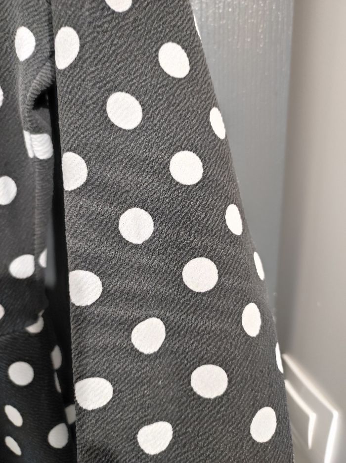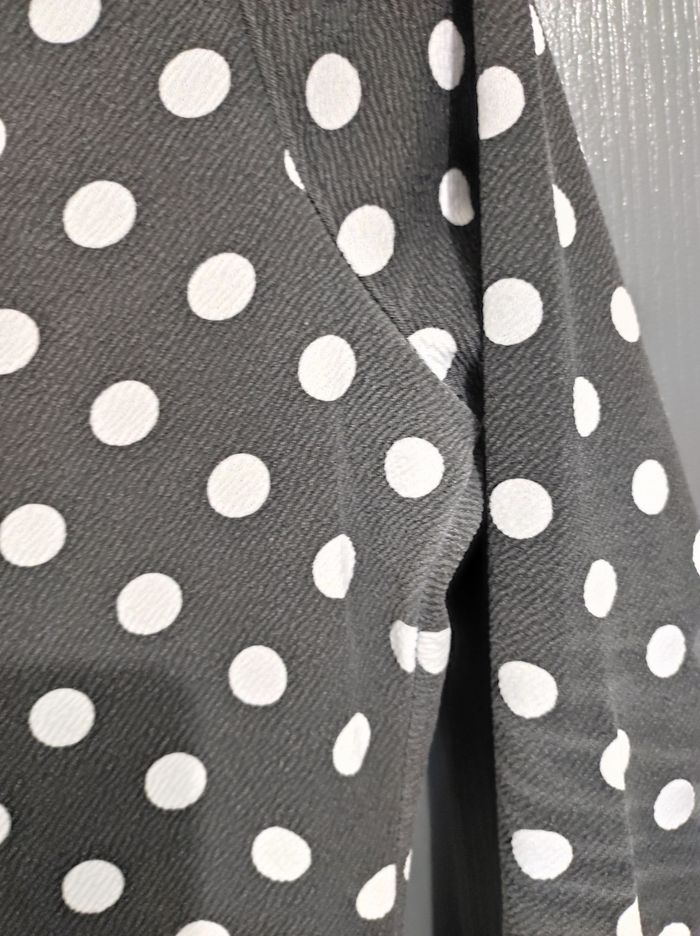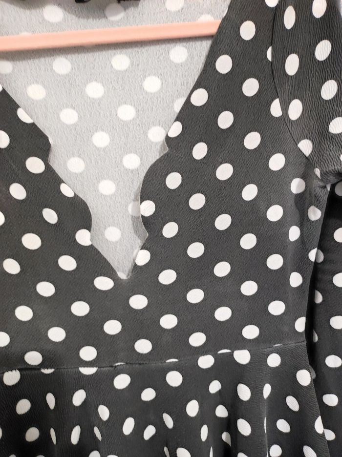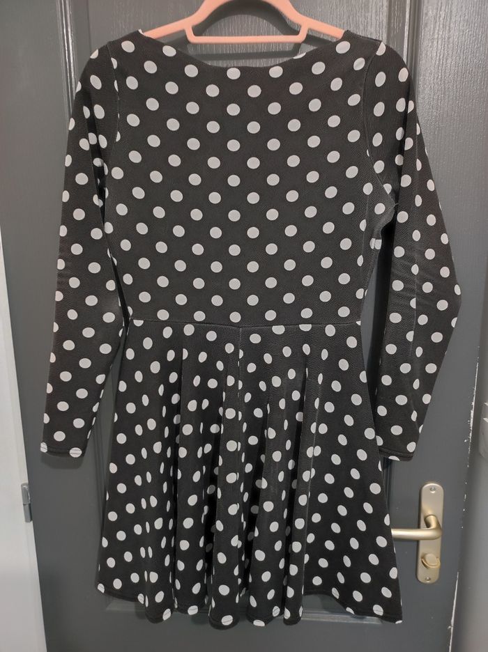 Robe noire patineuses avec gros points blanc manches longues Décolleté plongeant très plongeant. Robe style pin up bien vieilli mais peu porté Pas de tâches pas de trous 95% polyester et 5%elasthane