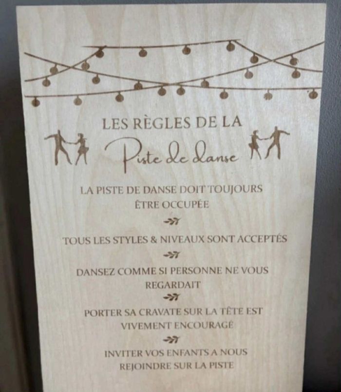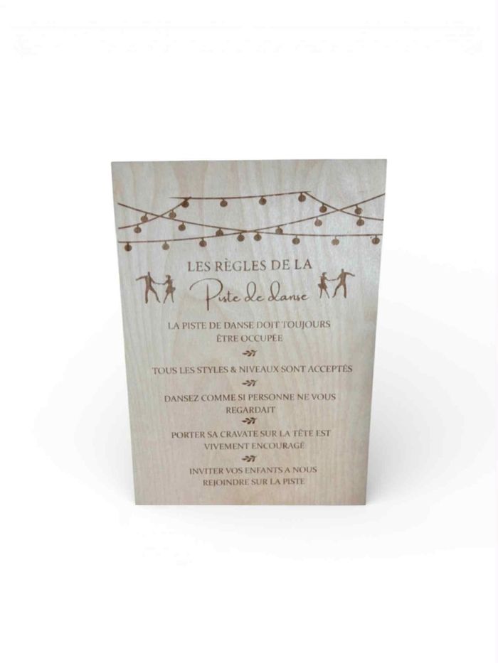 Affiche en bois au format A3, gravée avec finesse pour mettre en valeur votre piste de danse. Son bois naturel, avec ses textures et nuances chaleureuses, s’intègre parfaitement à l’atmosphère conviviale et festive de votre événement. Le message gravé est raffiné , guide vos invités vers cette piste tout en leur indiquant les règles de celle-ci. Placée au centre de l’espace dédié ou sur un chevalet à proximité, cette affiche devient un point de repère élégant, attirant l’œil tout en participant pleinement à l’ambiance chaleureuse du lieu. Elle invite vos convives à découvrir et s´amuser dans ce coin à leur rythme. Chaque affiche est unique et fabriquée avec un matériau naturel. L’article peux présenter des défauts visuel comme des rainures ou des noeuds. Chevalet en suppléant pour 2e