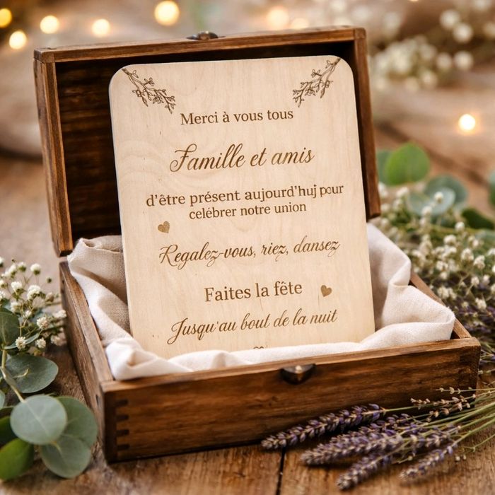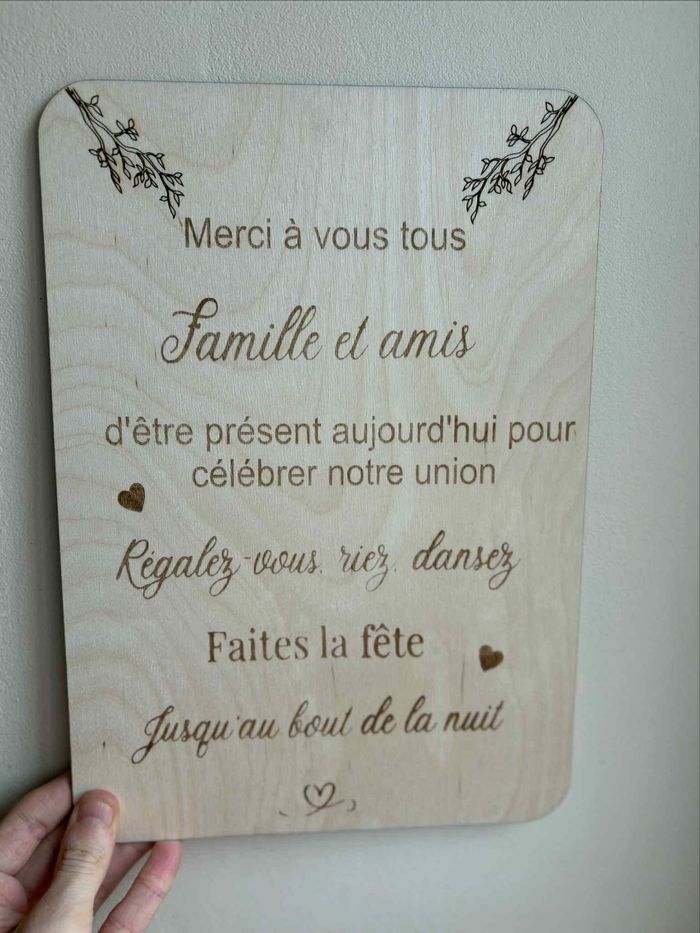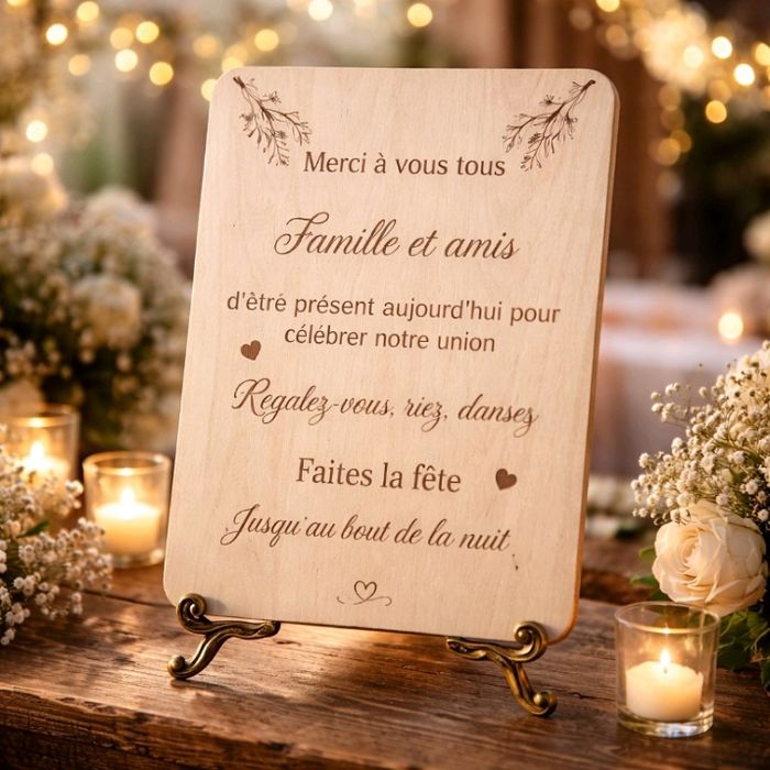 Affiche en bois au format A4, gravée avec soin pour accueillir chaleureusement vos invités dès leur arrivée. Le bois, avec sa texture naturelle et ses nuances authentiques, apporte une touche d’élégance et de convivialité, parfaitement adaptée à l’ambiance de votre événement. Le message principal, délicatement gravé, exprime votre gratitude envers ceux qui ont fait le déplacement pour être à vos côtés. Installée à l’entrée, sur un chevalet ou posée sur une table décorative, cette affiche invite vos invités à se sentir attendus et appréciés. Son design intemporel en fait un élément de décoration qui s’intègre harmonieusement au lieu de réception, tout en transmettant un message sincère et plein de bienveillance. Chaque affiche est unique et fabriqué avec un matériau naturel. L’article peux présenter des défauts visuel comme des rainures ou des noeuds. Chevalet en suppléant pour 2e