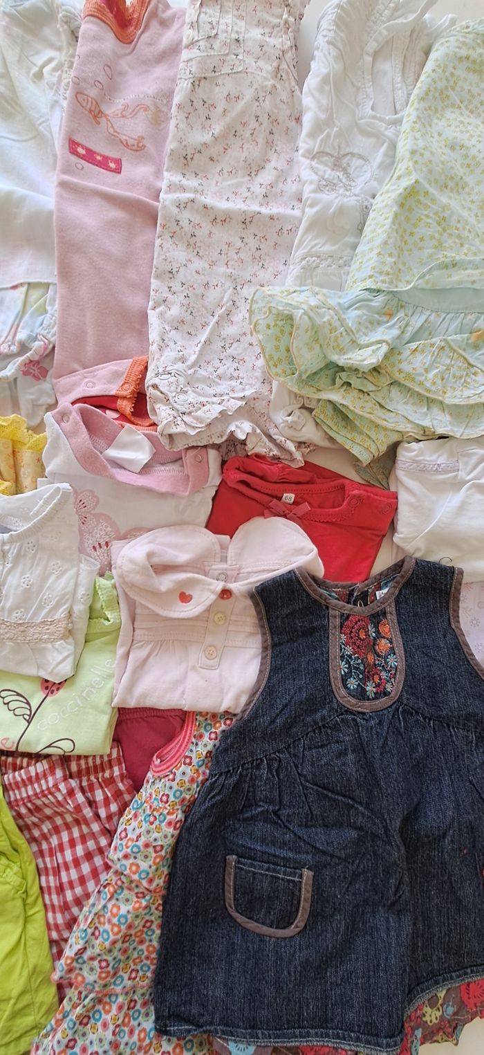 Vends un ensemble complet et varié de 22 vêtements pour bébé fille en taille 6 mois, parfait pour préparer la garde-robe estivale avec des pièces légères, colorées et confortables. Composition détaillée du lot : 3 robes : 1 robe en jean, 1 robe légère à volants avec des motifs floraux multicolores, 1 robe avec bloomer 5 salopettes & Barboteuses : 1 salopette courte vert pomme avec poche ventrale, 1 barboteuse rouge framboise avec détails blancs, 3 barboteuses 8 hauts : Un assortiment de plusieurs t-shirts à manches courtes et débardeurs aux couleurs vives (rose, rouge, jaune). 5 bas : Un pantalon à petits carreaux vichy rouge et blanc, des petits shorts et leggings légers pour compléter les tenues. 1 ensemble Aubisou Taille : 6 mois. Saison : Printemps / Été. Un petit défaut sur un legging (voir photo). Il n'y a aucun défaut apparent sur l'ensemble des autres pièces. Pensez à regrouper vos achats pour optimiser les frais de port !
