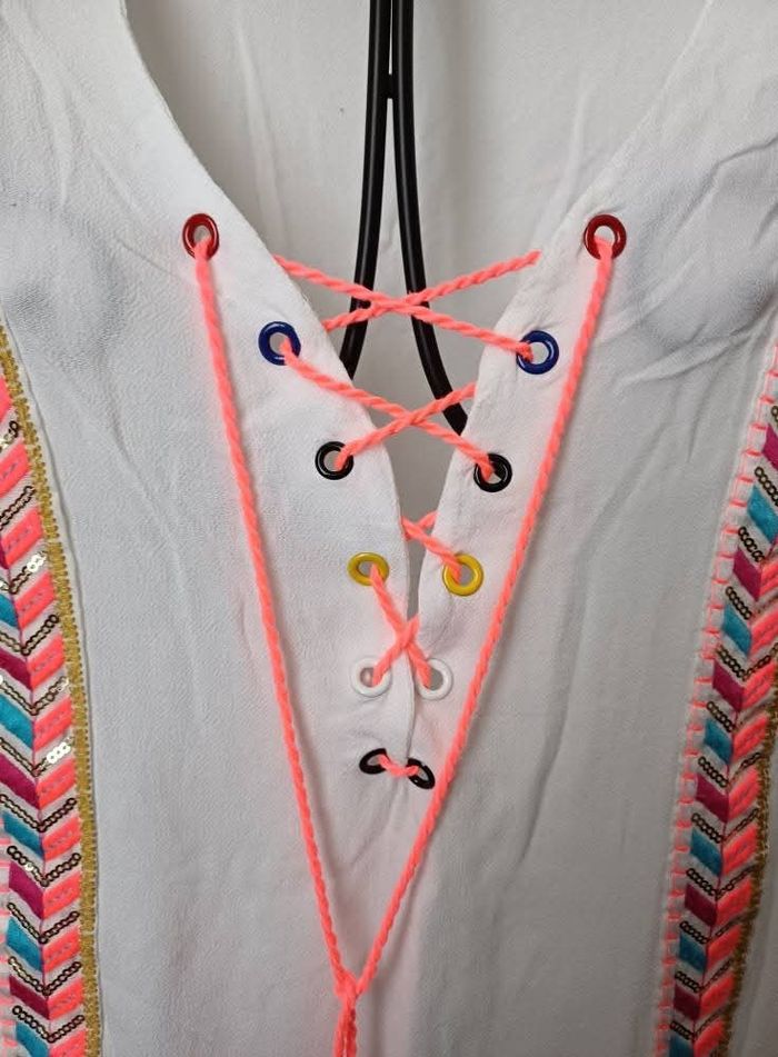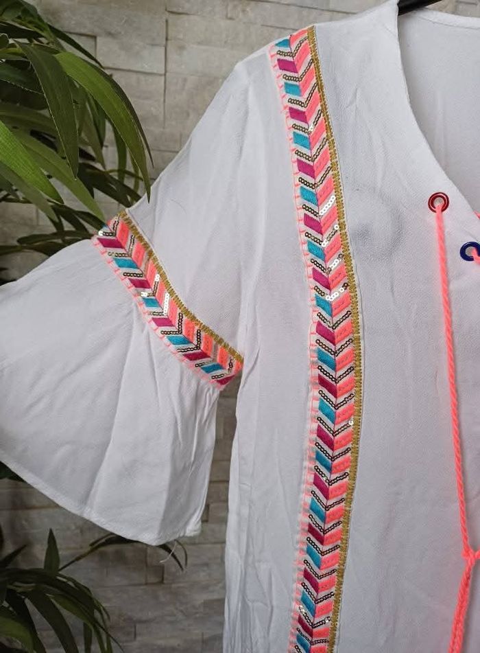 Broderies multicolores avec sequins dorés Cordons avec pompons Manches courtes évasées Taille S/M État neuf jamais portée