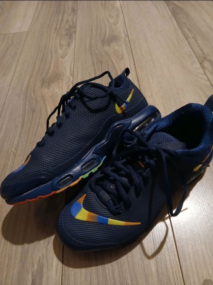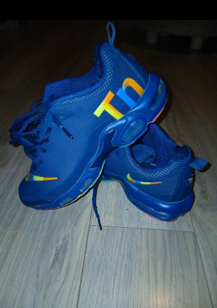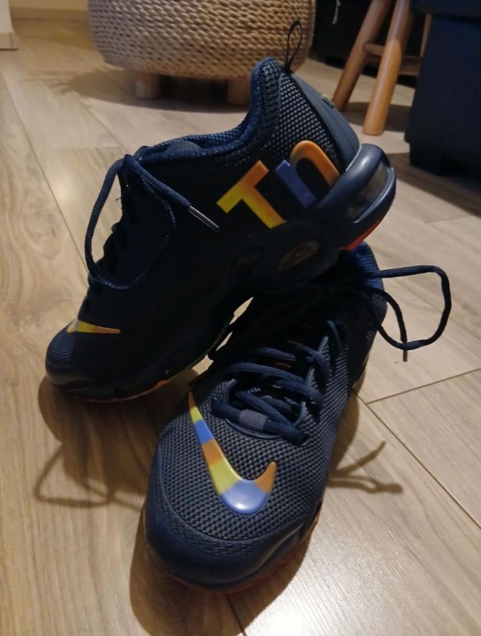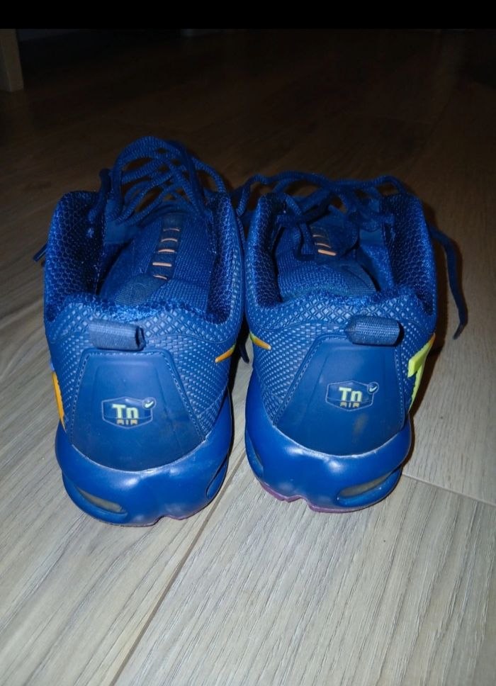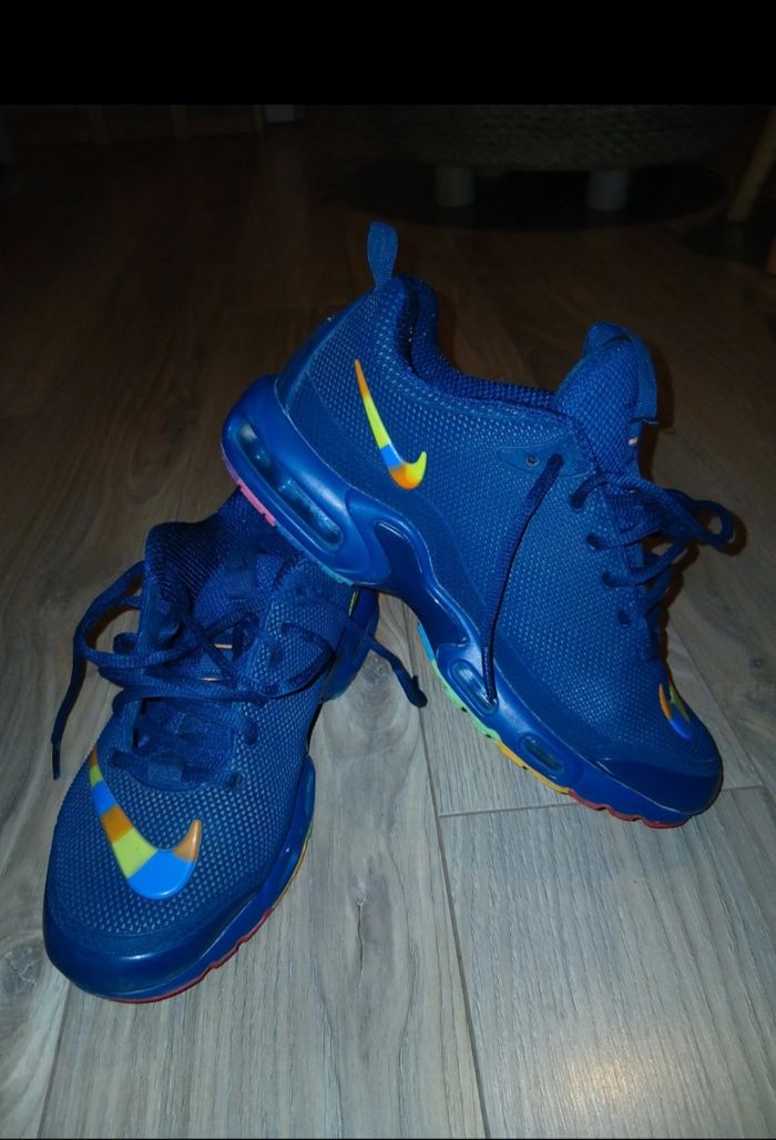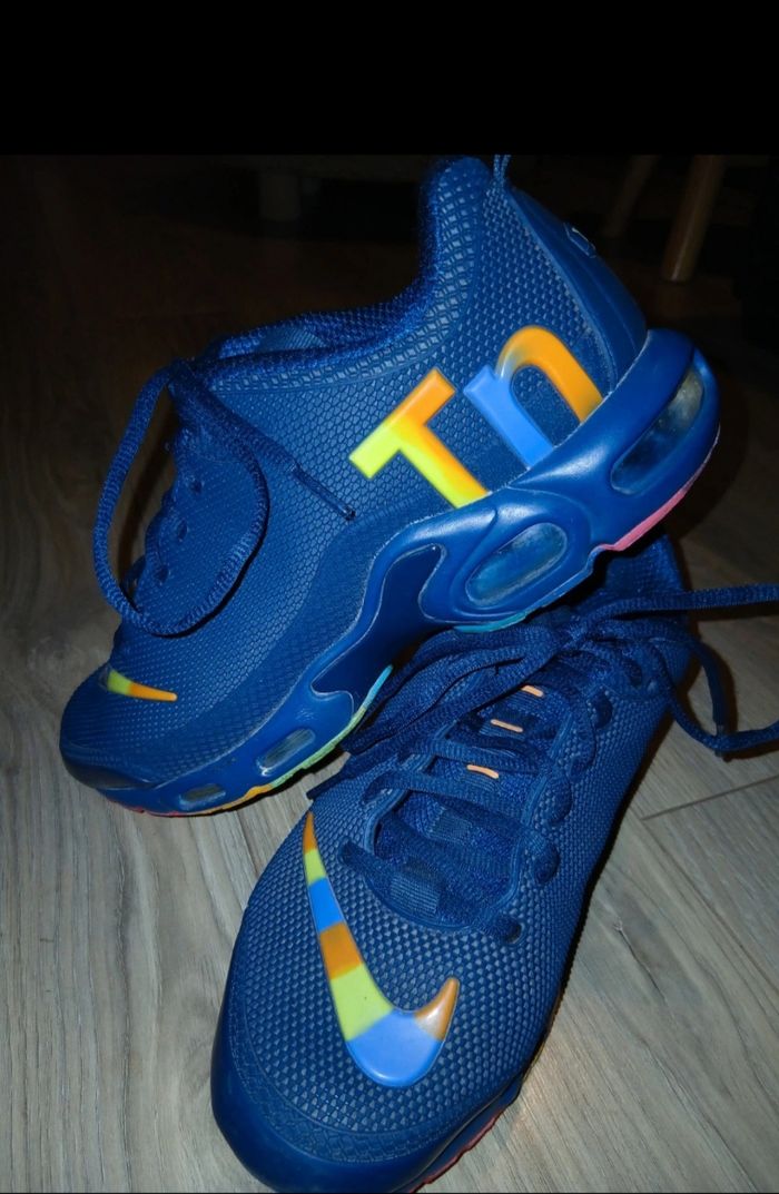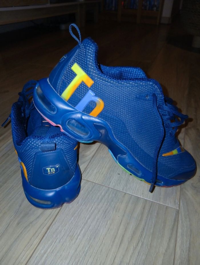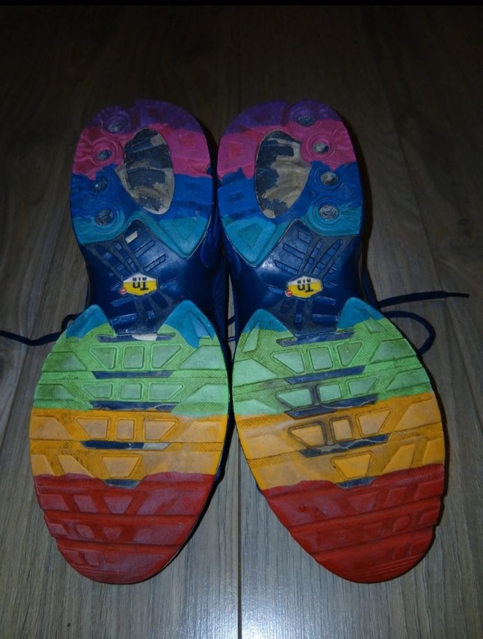 Tn en bon état, ont été portées mais restent correctes. Sur la chaussures gauche le bout de la semelle se décollait un peu alors il a été recollé pour ne pas accentuer mais cela ne se voit pas beaucoup. Matière plastique à part la languette donc facile à nettoyer. Quelques légères marques d'usure, cf photos.